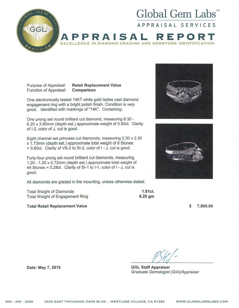 One electronically tested 14KT white gold ladies cast diamond engagement ring with a bright polish finish. Identified with markings of "14K". Condition is very good. Containing: One prong set round brilliant cut diamond, measuring 6.30 - 6.20 x 3.90mm (depth est.) approximate weight of 0.93ct. Clarity: I-2. Color: J, Cut is Good. Eight channel set princess cut diamonds, measuring 2.30 x 2.30 x 1.73mm (depth est.) approximate total weight of 8 Stones = 0.60ct. Clarity: VS-2 to SI-2. Color: I - J, Cut is Good. Forty-Four prong set round brilliant cut diamonds, measuring 1.20 - 1.20 x 0.72mm (depth est.) approximate total weight of 44 Stones = 0.28ct. Clarity: SI-1 to I-1. Color: I - J, Cut is Good. All diamonds are graded in the mounting, unless otherwise stated. Total Weight of Diamonds 1.81ct. Total Weight of Engagement Ring 6.20 grams. GGL Appraised at $7,905.00.