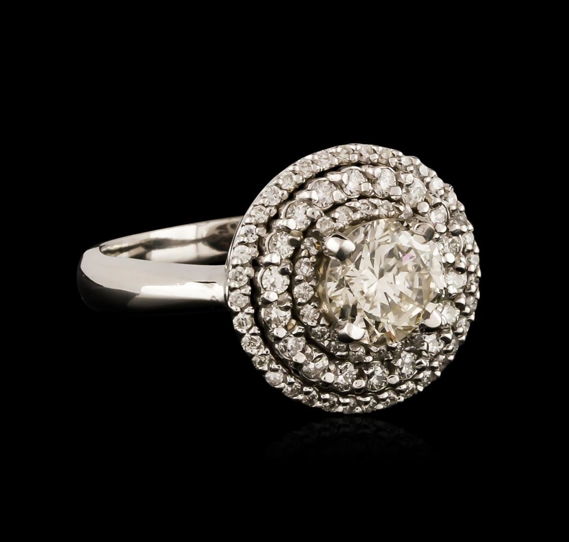 One electronically tested 14KT white gold ladies cast diamond ring with a bright polish finish. The featured diamond is set within tiered diamond bezels, completed by a two millimeter wide band. Identified with markings of "K14". Condition is new, good workmanship. Containing: One prong set round brilliant cut diamond, measuring 6.52 - 6.46 x 4.02mm (depth est.), 6.00.% GTCF approximate weight of 1.11ct with a medium blue fluorescence. Faint brown secondary color throughout. Graded in the setting. Clarity: I-1. Color: K. Depth 61.9%. Table 70.9%. Seventy-Four prong set round brilliant cut diamonds, measuring 1.50 - 1.20 x 0.81mm (depth est.) approximate total weight of 74 Stones = 0.70ct. Graded in the setting. Clarity: SI-2 to I-1. Color: G - I. Total Weight of Diamonds 1.81ct. Total Weight of Ring 6.12 grams. AIG Appraised at $13,420.00.