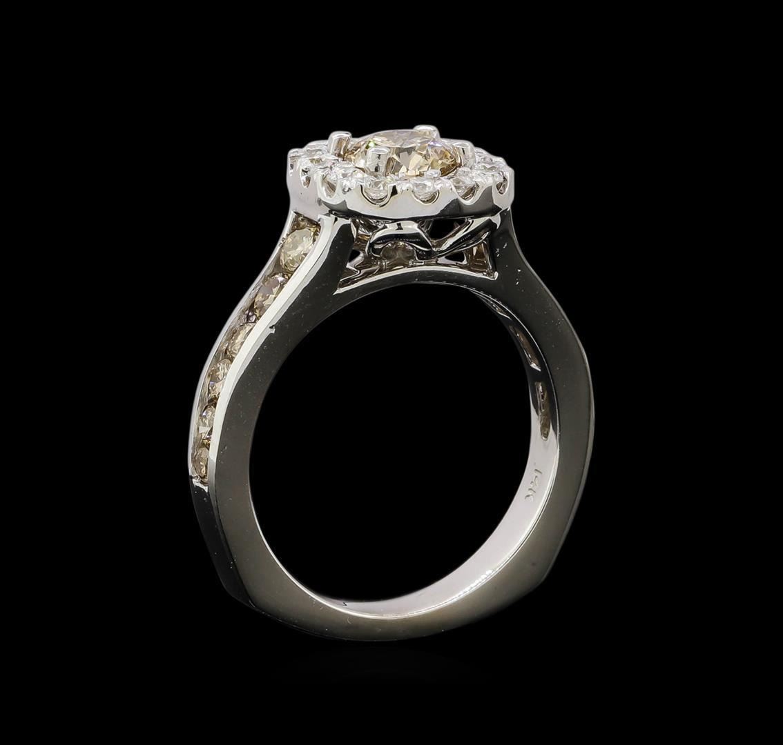 One electronically tested 14KT white gold ladies cast diamond engagement ring. Identified with markings of "14K". Condition is new. Containing: One prong set round brilliant cut diamond, measuring 5.50 - 5.50 x 3.30mm (depth est.) approximate weight of 0.71ct. Clarity: SI-2, Cut is Good. Twelve channel set round brilliant cut diamonds, measuring 2.50 - 1.50 x 1.20mm (depth est.) approximate total weight of 12 Stones = 0.73ct. Clarity: VS-2 to SI-2, Cut is Good. Fourteen prong set round brilliant cut diamonds, measuring 2.00 - 2.00 x 1.20mm (depth est.) approximate total weight of 14 Stones = 0.37ct. Clarity: SI-2 to I-1. Color: H - I, Cut is Good. Diamonds are graded in the mounting, unless otherwise stated. Total Weight of Diamonds 1.81ct. Total Weight of Engagement Ring 6.00 grams. GGL Appraised.