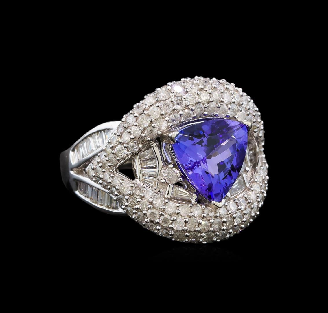 One electronically tested 14KT white gold ladies cast tanzanite and diamond ring with a tapered shank with a bright polish finish. Trademark is Orianne. Identified with markings of "14K". Condition is new. Containing: One prong set triangle modified brilliant cut natural tanzanite, measuring 8.01 x 7.23 x 5.17mm, approximate weight of 1.81ct., clarity is eye clean, type I, medium light, very slightly grayish, bluish violet color, (GIA bV 4/3), cut is good. One Hundred Forty-Six prong set round brilliant cut diamonds, measuring 1.20 - 1.20 x 0.72mm (depth est.) approximate total weight of 146 Stones = 0.92ct. Clarity: I-1 to I-2. Color: I - J. Thirty-Eight channel set baguette cut diamonds, measuring 1.80 x 1.10 x 0.94mm (depth est.) approximate total weight of 38 Stones = 0.65ct. Clarity: SI-1. Color: I - J. Two prong set round brilliant cut diamonds, measuring 1.80 - 1.80 x 1.08mm (depth est.) approximate total weight of 2 Stones = 0.04ct. Clarity: I-1 to I-2. Color: I - J. All diamonds and colored gemstones are graded in the mounting, unless otherwise stated. Colored gemstones are presumed to have been subjected to commonly used enhancement processes. Total Weight of Colored Stones 1.81ct. Total Weight of Diamonds 1.61ct. Total Weight of Ring 7.90 grams. GGL Appraised at $7,415.00.
