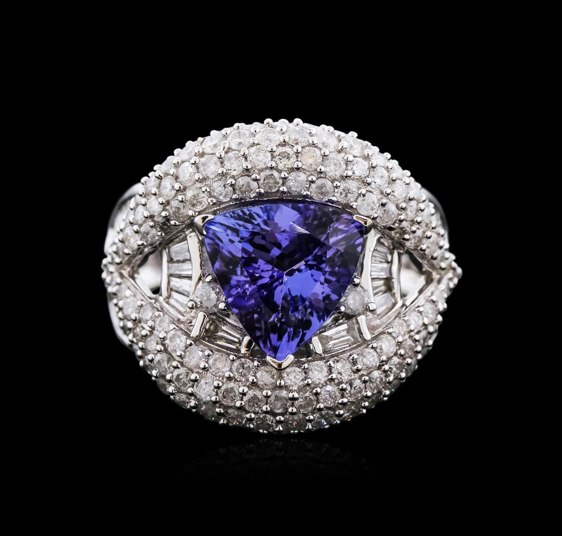 One electronically tested 14KT white gold ladies cast tanzanite and diamond ring with a tapered shank with a bright polish finish. Trademark is Orianne. Identified with markings of "14K". Condition is new. Containing: One prong set triangle modified brilliant cut natural tanzanite, measuring 8.01 x 7.23 x 5.17mm, approximate weight of 1.81ct., clarity is eye clean, type I, medium light, very slightly grayish, bluish violet color, (GIA bV 4/3), cut is good. One Hundred Forty-Six prong set round brilliant cut diamonds, measuring 1.20 - 1.20 x 0.72mm (depth est.) approximate total weight of 146 Stones = 0.92ct. Clarity: I-1 to I-2. Color: I - J. Thirty-Eight channel set baguette cut diamonds, measuring 1.80 x 1.10 x 0.94mm (depth est.) approximate total weight of 38 Stones = 0.65ct. Clarity: SI-1. Color: I - J. Two prong set round brilliant cut diamonds, measuring 1.80 - 1.80 x 1.08mm (depth est.) approximate total weight of 2 Stones = 0.04ct. Clarity: I-1 to I-2. Color: I - J. All diamonds and colored gemstones are graded in the mounting, unless otherwise stated. Colored gemstones are presumed to have been subjected to commonly used enhancement processes. Total Weight of Colored Stones 1.81ct. Total Weight of Diamonds 1.61ct. Total Weight of Ring 7.90 grams. GGL Appraised at $7,415.00.