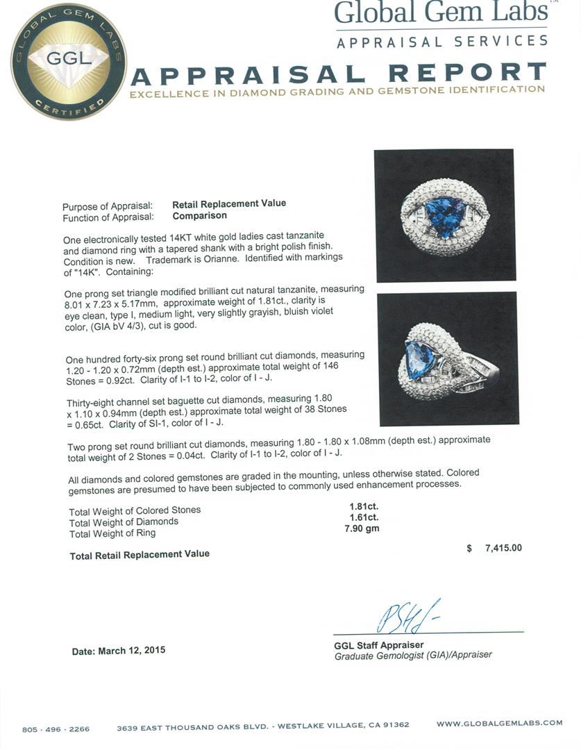 One electronically tested 14KT white gold ladies cast tanzanite and diamond ring with a tapered shank with a bright polish finish. Trademark is Orianne. Identified with markings of "14K". Condition is new. Containing: One prong set triangle modified brilliant cut natural tanzanite, measuring 8.01 x 7.23 x 5.17mm, approximate weight of 1.81ct., clarity is eye clean, type I, medium light, very slightly grayish, bluish violet color, (GIA bV 4/3), cut is good. One Hundred Forty-Six prong set round brilliant cut diamonds, measuring 1.20 - 1.20 x 0.72mm (depth est.) approximate total weight of 146 Stones = 0.92ct. Clarity: I-1 to I-2. Color: I - J. Thirty-Eight channel set baguette cut diamonds, measuring 1.80 x 1.10 x 0.94mm (depth est.) approximate total weight of 38 Stones = 0.65ct. Clarity: SI-1. Color: I - J. Two prong set round brilliant cut diamonds, measuring 1.80 - 1.80 x 1.08mm (depth est.) approximate total weight of 2 Stones = 0.04ct. Clarity: I-1 to I-2. Color: I - J. All diamonds and colored gemstones are graded in the mounting, unless otherwise stated. Colored gemstones are presumed to have been subjected to commonly used enhancement processes. Total Weight of Colored Stones 1.81ct. Total Weight of Diamonds 1.61ct. Total Weight of Ring 7.90 grams. GGL Appraised at $7,415.00.