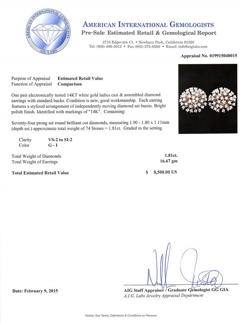 One pair electronically tested 14KT white gold ladies cast & assembled diamond earrings with standard backs. Each earring features a stylized arrangement of independently moving diamond set bursts. Bright polish finish. Identified with markings of "14K". Condition is new, good workmanship. Containing: Seventy-Four prong set round brilliant cut diamonds, measuring 1.90 - 1.80 x 1.11mm (depth est.) approximate total weight of 74 Stones = 1.81ct. Graded in the setting. Clarity: VS-2 to SI-2. Color: G - I. Total Weight of Diamonds 1.81ct. Total Weight of Earrings 16.67 grams. AIG Appraised at $8,500.00.