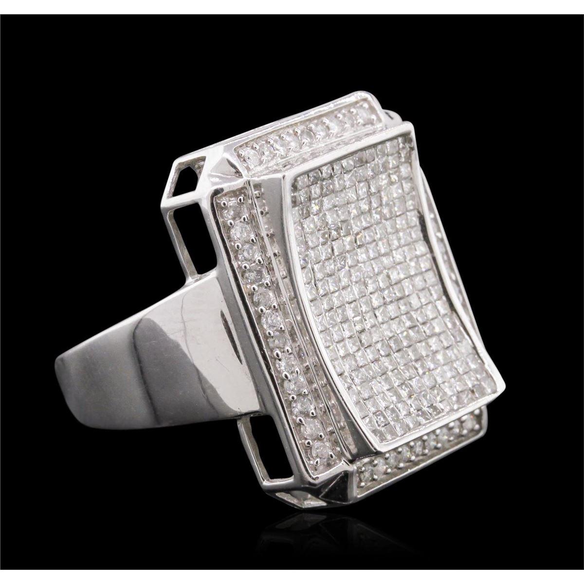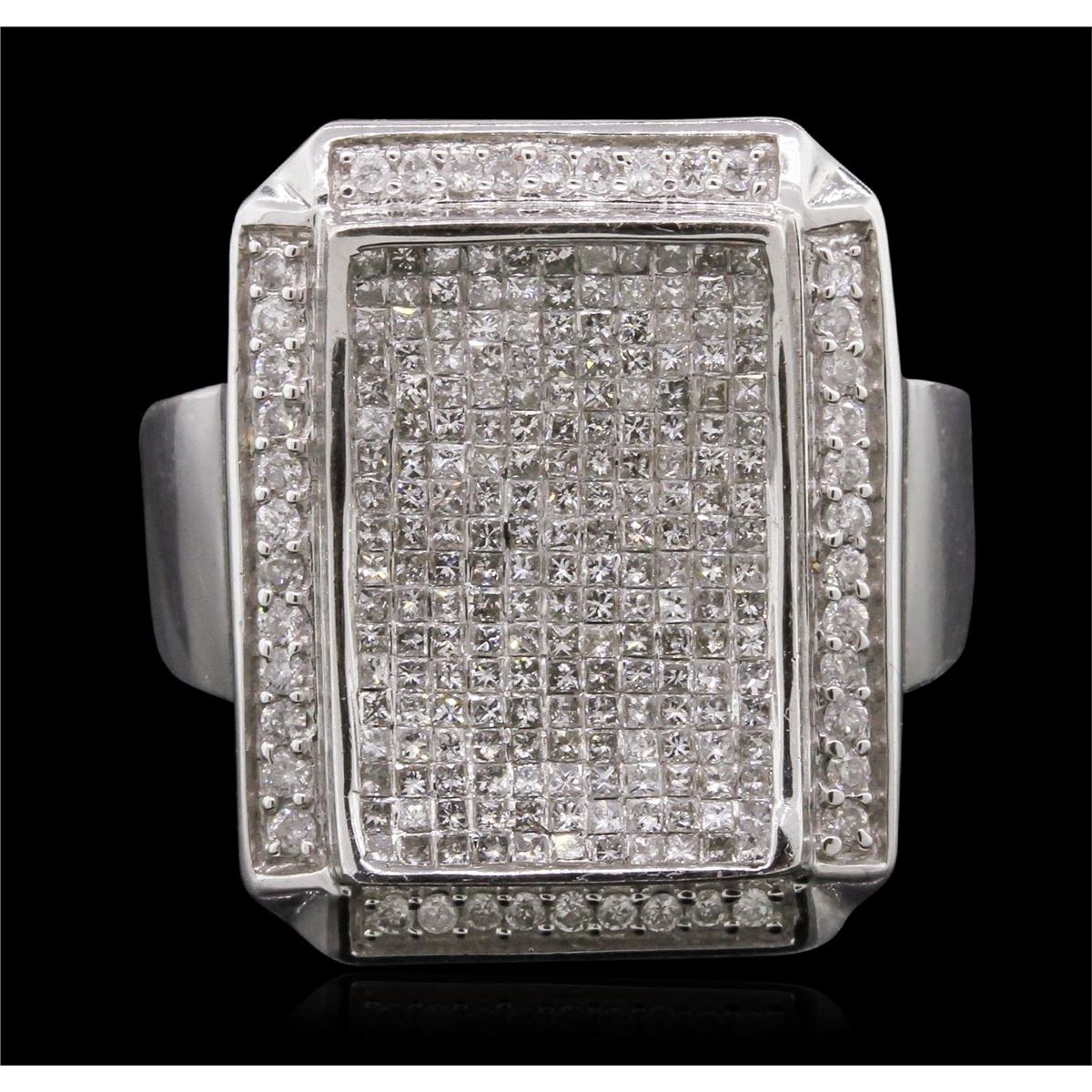 One electronically tested 14KT white gold man's combination cast & assembled ring with a bright polish finish. Condition is new. Identified with markings of "14K". Containing: One Hundred Eighty pave' set princess cut diamonds, measuring 1.10 x 1.10 x 0.83mm (depth est.) approximate. Total Weight of 180 Stones = 1.48ct. Clarity: I-1 to I-2. Color: H - I, Cut is Good. Forty-Two prong set round brilliant cut diamonds, measuring 1.30 - 1.30 x 0.78mm (depth est.) approximate. Total Weight of 42 Stones = 0.34ct. Clarity: I-1 to I-2. Color: H - I, Cut is Good. Total Weight of Diamonds 1.81ct. Total Weight of Ring 12.40gm. GGL Appraised at $8,595.00.