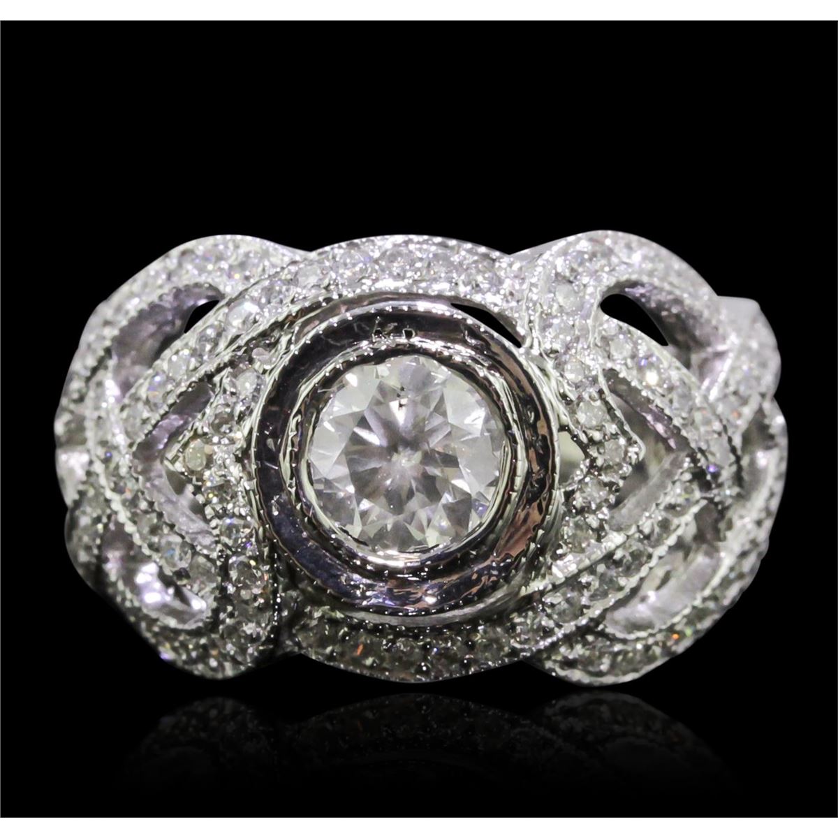 One electronically tested 14KT white gold ladies combination cast & assembled engagement ring with a flat shank with a bright polish finish. Identified with markings of "K14". Condition is new. Containing: One bezel set round brilliant cut diamond, measuring 6.50 - 6.50 x 4.00mm (depth est.) approximate weight of 1.03ct. Clarity: I-1. Color: K, Cut is Good. One Hundred Twenty-Four prong set round brilliant cut diamonds, measuring 1.20 - 1.20 x 0.72mm (depth est.) approximate total weight of 124 Stones = 0.78ct. Clarity: SI-2 to I-1. Color: I - J, Cut is Good. All diamonds are graded in the mounting, unless otherwise stated. Total Weight of Diamonds 1.81ct. Total Weight of Ring 8.80 grams. GGL Appraised at $14,515.00.