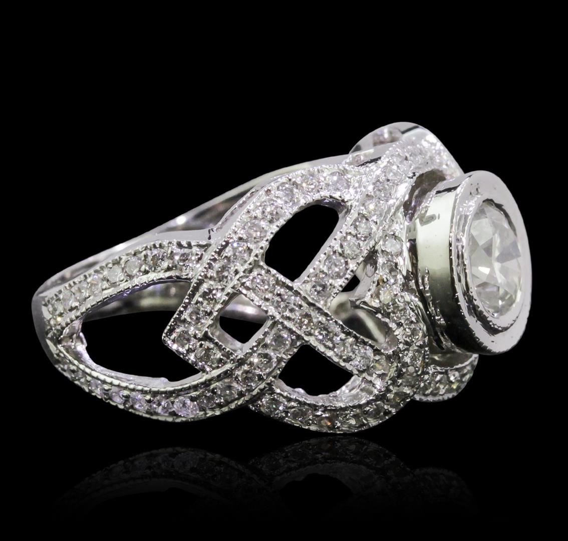 One electronically tested 14KT white gold ladies combination cast & assembled engagement ring with a flat shank with a bright polish finish. Identified with markings of "K14". Condition is new. Containing: One bezel set round brilliant cut diamond, measuring 6.50 - 6.50 x 4.00mm (depth est.) approximate weight of 1.03ct. Clarity: I-1. Color: K, Cut is Good. One Hundred Twenty-Four prong set round brilliant cut diamonds, measuring 1.20 - 1.20 x 0.72mm (depth est.) approximate total weight of 124 Stones = 0.78ct. Clarity: SI-2 to I-1. Color: I - J, Cut is Good. All diamonds are graded in the mounting, unless otherwise stated. Total Weight of Diamonds 1.81ct. Total Weight of Ring 8.80 grams. GGL Appraised at $14,515.00.