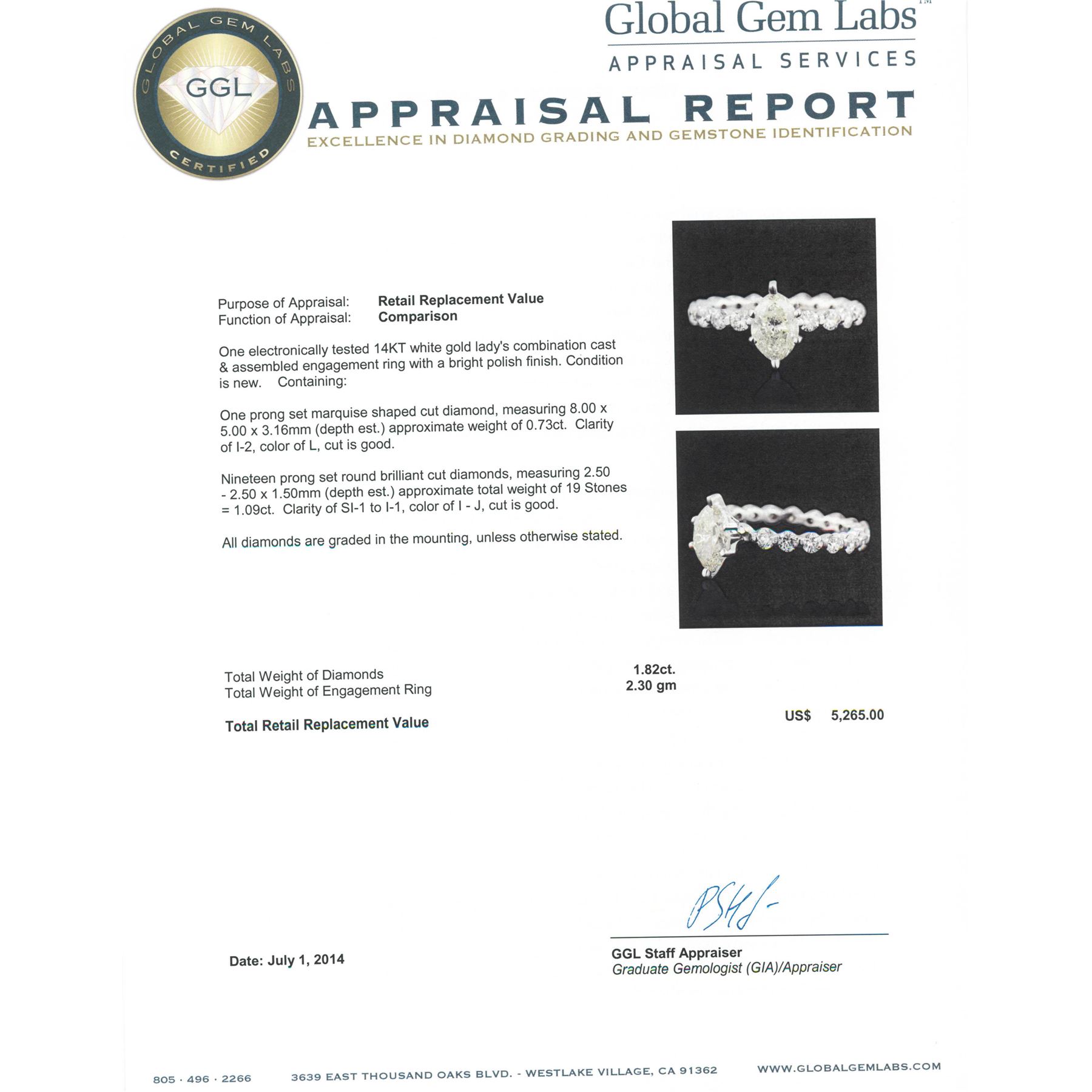 One electronically tested 14KT white gold Ladies combination cast & assembled engagement ring with a bright polish finish. Condition is new. Containing: One prong set marquise shaped cut diamond, measuring 8.00 x 5.00 x 3.16mm (depth est.) approximate weight of 0.73ct. Clarity: I-2. Color: L, Cut is Good. Nineteen prong set round brilliant cut diamonds, measuring 2.50 - 2.50 x 1.50mm (depth est.) approximate total weight of 19 Stones = 1.09ct. Clarity: SI-1 to I-1. Color: I - J, Cut is Good. All diamonds are graded in the mounting, unless otherwise stated. Total Weight of Diamonds 1.82ct. Total Weight of Engagement Ring 2.30 grams. GGL Appraised at $5,265.00.