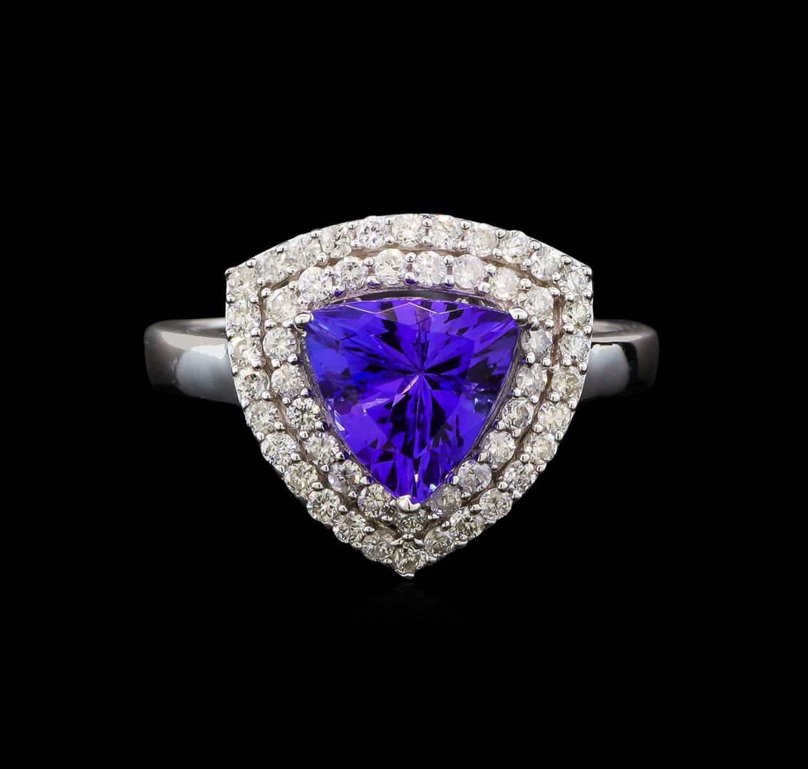 One electronically tested 14KT white gold ladies cast tanzanite and diamond ring with a flat shank with a bright polish finish. Trademark is Orianne. Identified with markings of "14K". Condition is new. Containing: One prong set triangle modified brilliant cut natural tanzanite, measuring 7.52 x 7.42 x 5.41mm, approximate weight of 1.82ct., clarity is eye clean, type I, medium light, moderately strong, violetish blue color, (GIA vB 4/4), cut is good. Fifty-One prong set round brilliant cut diamonds, measuring 1.30 - 1.30 x 0.78mm (depth est.) approximate total weight of 51 Stones = 0.41ct. Clarity: SI-2 to I-2. Color: I - J, Cut is Good. All diamonds and colored gemstones are graded in the mounting, unless otherwise stated. Colored gemstones are presumed to have been subjected to commonly used enhancement processes. Total Weight of Colored Stones 1.82ct. Total Weight of Diamonds 0.41ct. Total Weight of Ring 3.70 grams. GGL Appraised at $3,135.00.