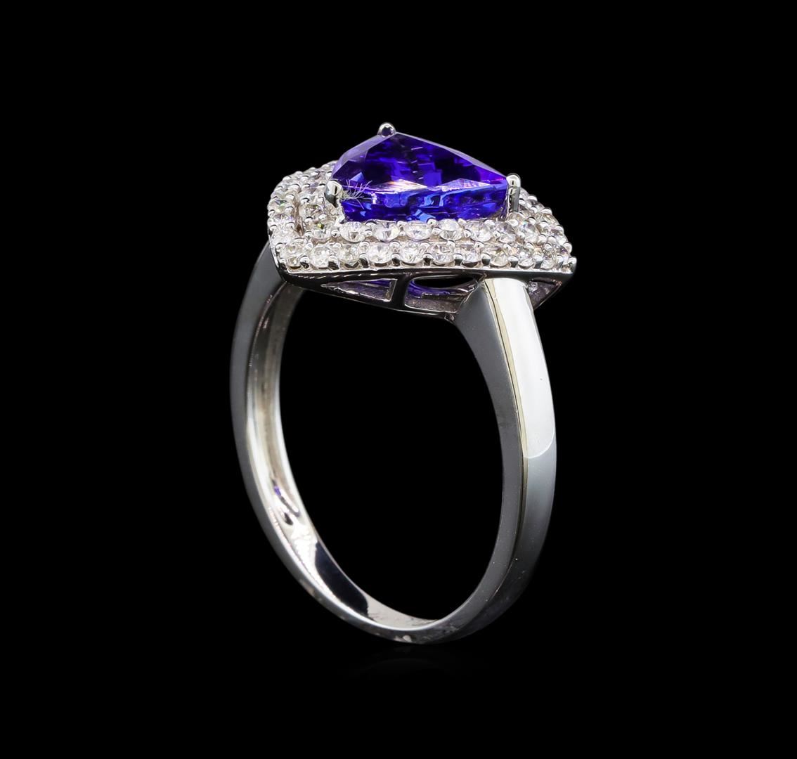One electronically tested 14KT white gold ladies cast tanzanite and diamond ring with a flat shank with a bright polish finish. Trademark is Orianne. Identified with markings of "14K". Condition is new. Containing: One prong set triangle modified brilliant cut natural tanzanite, measuring 7.52 x 7.42 x 5.41mm, approximate weight of 1.82ct., clarity is eye clean, type I, medium light, moderately strong, violetish blue color, (GIA vB 4/4), cut is good. Fifty-One prong set round brilliant cut diamonds, measuring 1.30 - 1.30 x 0.78mm (depth est.) approximate total weight of 51 Stones = 0.41ct. Clarity: SI-2 to I-2. Color: I - J, Cut is Good. All diamonds and colored gemstones are graded in the mounting, unless otherwise stated. Colored gemstones are presumed to have been subjected to commonly used enhancement processes. Total Weight of Colored Stones 1.82ct. Total Weight of Diamonds 0.41ct. Total Weight of Ring 3.70 grams. GGL Appraised.