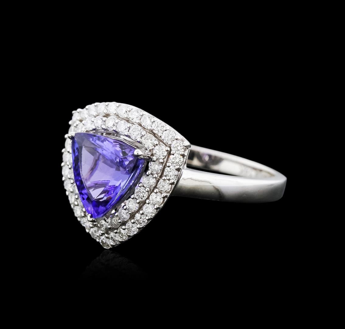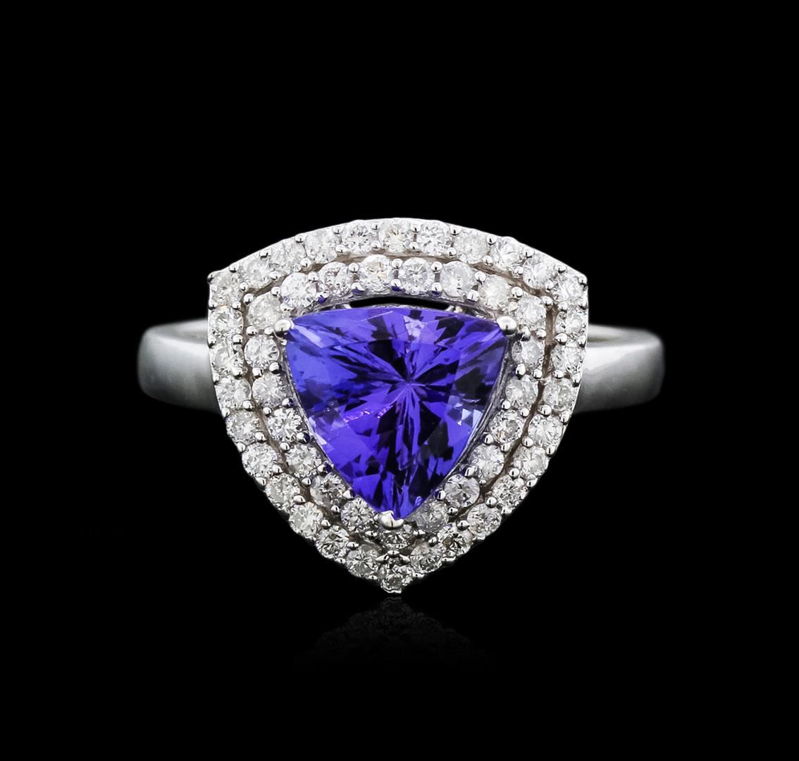 One electronically tested 14KT white gold ladies cast tanzanite and diamond ring with a flat shank with a bright polish finish. Trademark is Orianne. Identified with markings of "14K". Condition is new. Containing: One prong set triangle modified brilliant cut natural tanzanite, measuring 7.52 x 7.42 x 5.41mm, approximate weight of 1.82ct., clarity is eye clean, type I, medium light, moderately strong, violetish blue color, (GIA vB 4/4), cut is good. Fifty-One prong set round brilliant cut diamonds, measuring 1.30 - 1.30 x 0.78mm (depth est.) approximate total weight of 51 Stones = 0.41ct. Clarity: SI-2 to I-2. Color: I - J, Cut is Good. All diamonds and colored gemstones are graded in the mounting, unless otherwise stated. Colored gemstones are presumed to have been subjected to commonly used enhancement processes. Total Weight of Colored Stones 1.82ct. Total Weight of Diamonds 0.41ct. Total Weight of Ring 3.70 grams. GGL Appraised at $3,135.00.