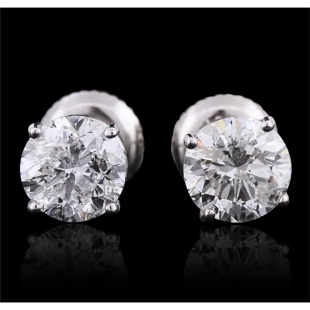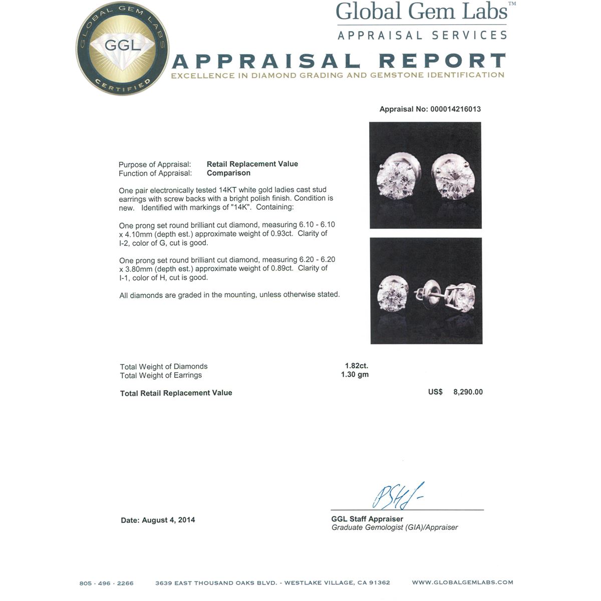 One pair electronically tested 14KT white gold ladies cast stud earrings with screw backs with a bright polish finish. Condition is new. Identified with markings of "14K". Containing: One prong set round brilliant cut diamond, measuring 6.10 - 6.10 x 4.10mm (depth est.) approximate weight of 0.93ct. Clarity: I-2. Color: G, Cut is Good. One prong set round brilliant cut diamond, measuring 6.20 - 6.20 x 3.80mm (depth est.) approximate weight of 0.89ct. Clarity: I-1. Color: H, Cut is Good. All diamonds are graded in the mounting, unless otherwise stated. Total Weight of Diamonds 1.82ct. Total Weight of Earrings 1.30 grams. GGL Appraised at $8,290.00.
