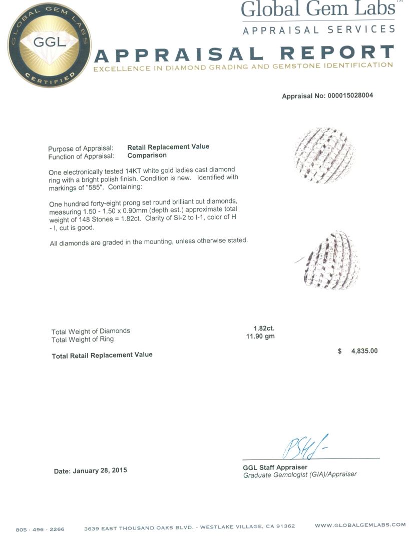 One electronically tested 14KT white gold ladies cast diamond ring with a bright polish finish. Identified with markings of "585". Condition is new. Containing: One Hundred Forty-Eight prong set round brilliant cut diamonds, measuring 1.50 - 1.50 x 0.90mm (depth est.) approximate total weight of 148 Stones = 1.82ct. Clarity: SI-2 to I-1. Color: H - I, Cut is Good. All diamonds are graded in the mounting, unless otherwise stated. Total Weight of Diamonds 1.82ct. Total Weight of Ring 11.90 grams. GGL Appraised at $4,835.00.