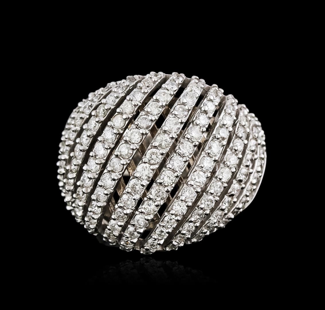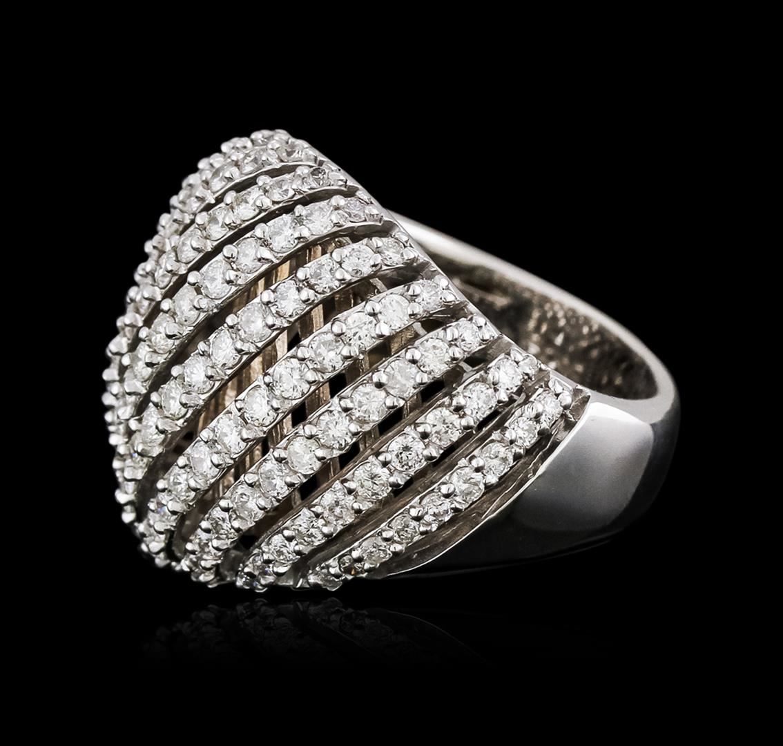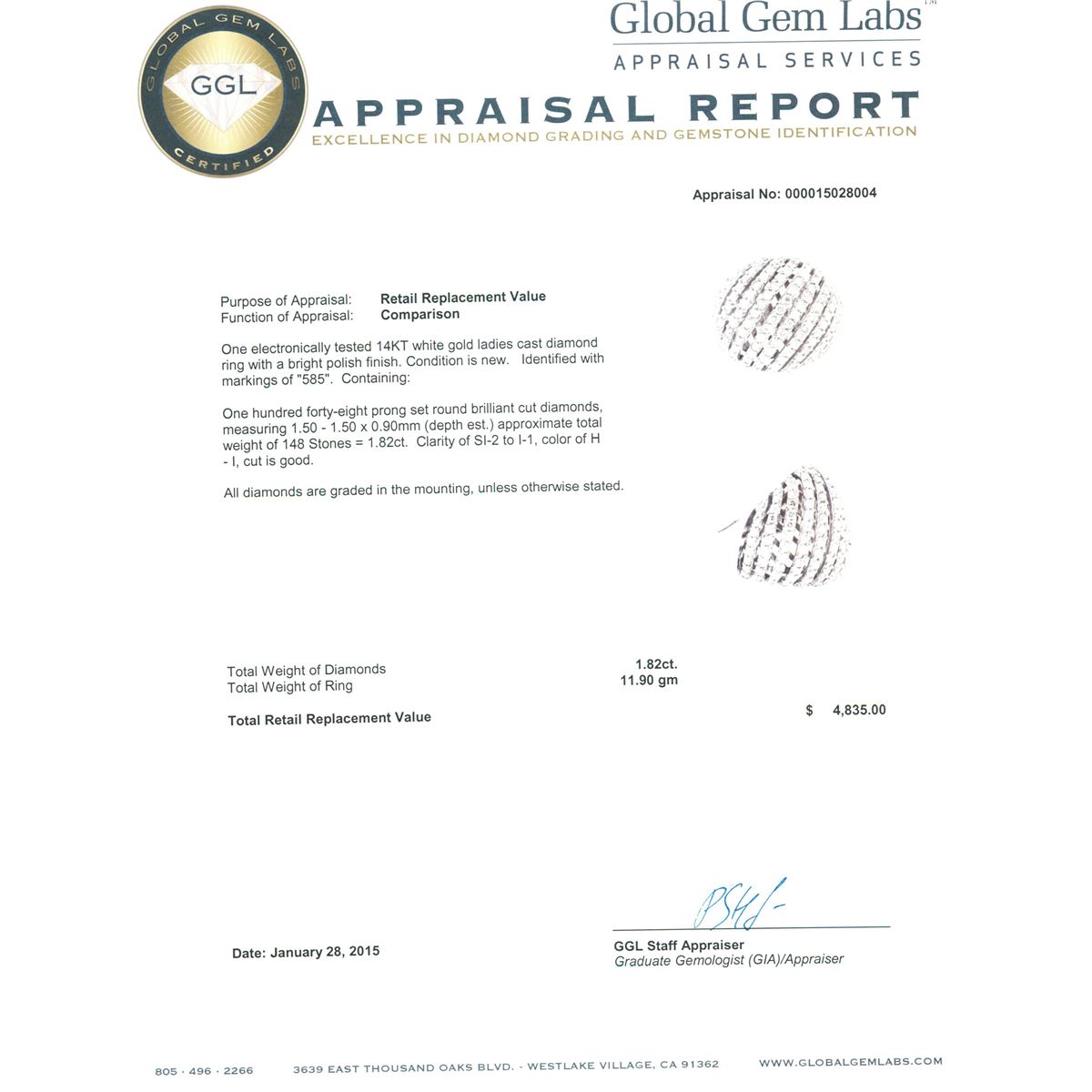 One electronically tested 14KT white gold ladies cast diamond ring with a bright polish finish. Identified with markings of "585". Condition is new. Containing: One Hundred Forty-Eight prong set round brilliant cut diamonds, measuring 1.50 - 1.50 x 0.90mm (depth est.) approximate total weight of 148 Stones = 1.82ct. Clarity: SI-2 to I-1. Color: H - I, Cut is Good. All diamonds are graded in the mounting, unless otherwise stated. Total Weight of Diamonds 1.82ct. Total Weight of Ring 11.90 grams. GGL Appraised at $4,835.00.