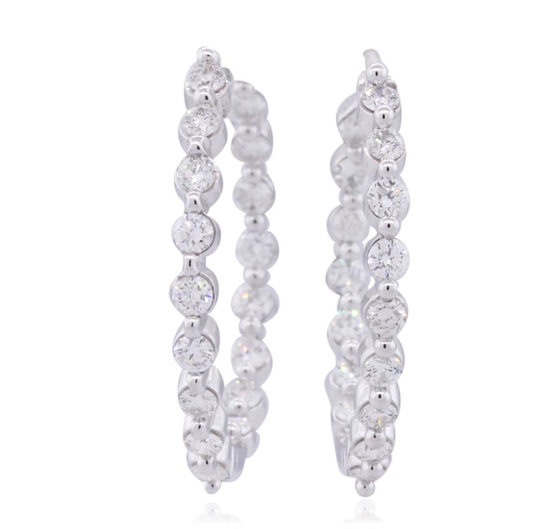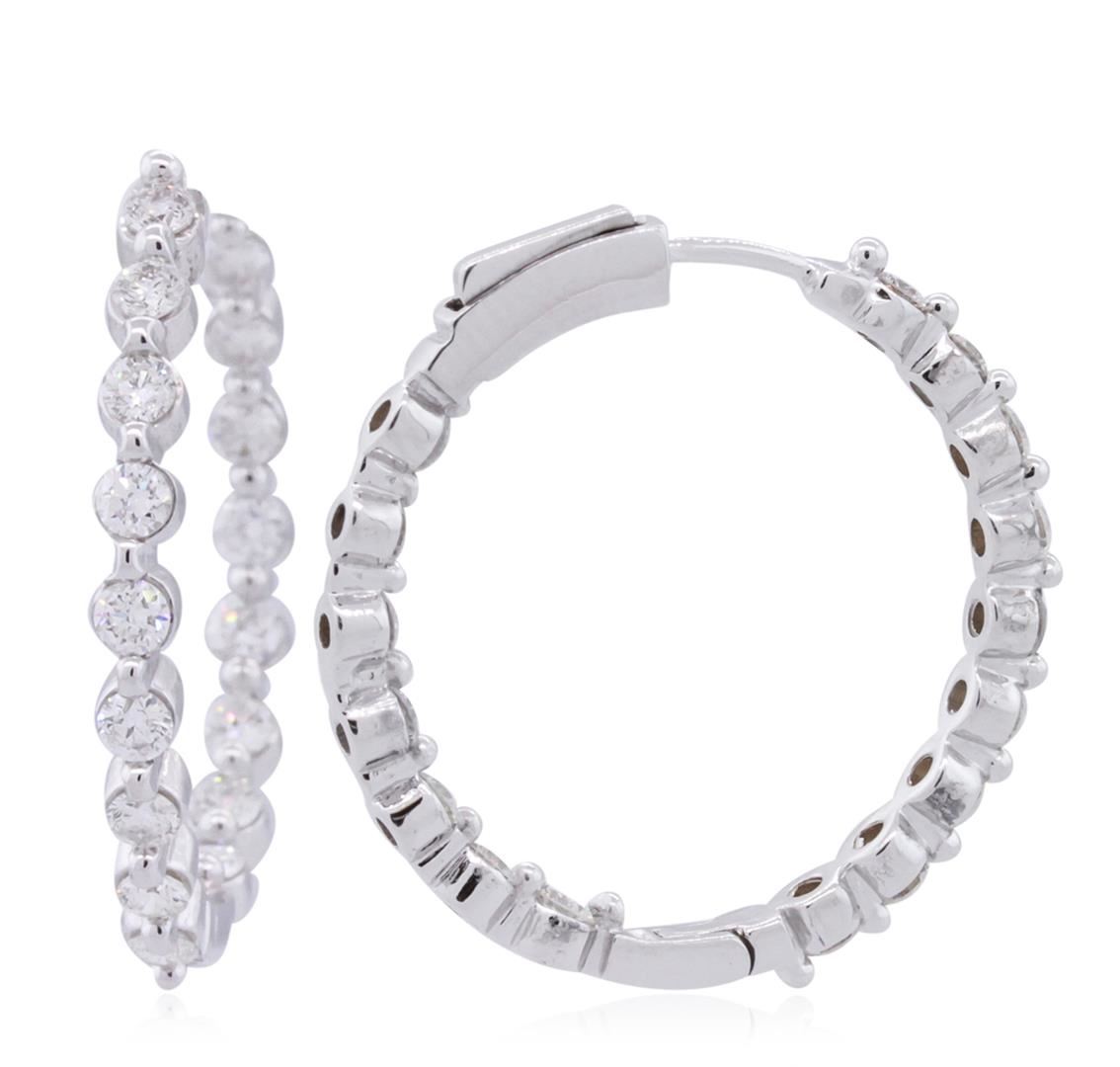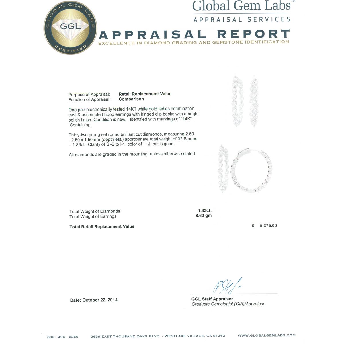 One pair electronically tested 14KT white gold ladies combination cast & assembled hoop earrings with hinged clip backs with a bright polish finish. Identified with markings of "14K". Condition is new. Containing: Thirty-Two prong set round brilliant cut diamonds, measuring 2.50 - 2.50 x 1.50mm (depth est.) approximate total weight of 32 Stones = 1.83ct. Clarity: SI-2 to I-1. Color: I - J, Cut is Good. All diamonds are graded in the mounting, unless otherwise stated. Total Weight of Diamonds 1.83ct. Total Weight of Earrings 8.60 grams. GGL Appraised at $5,375.00.