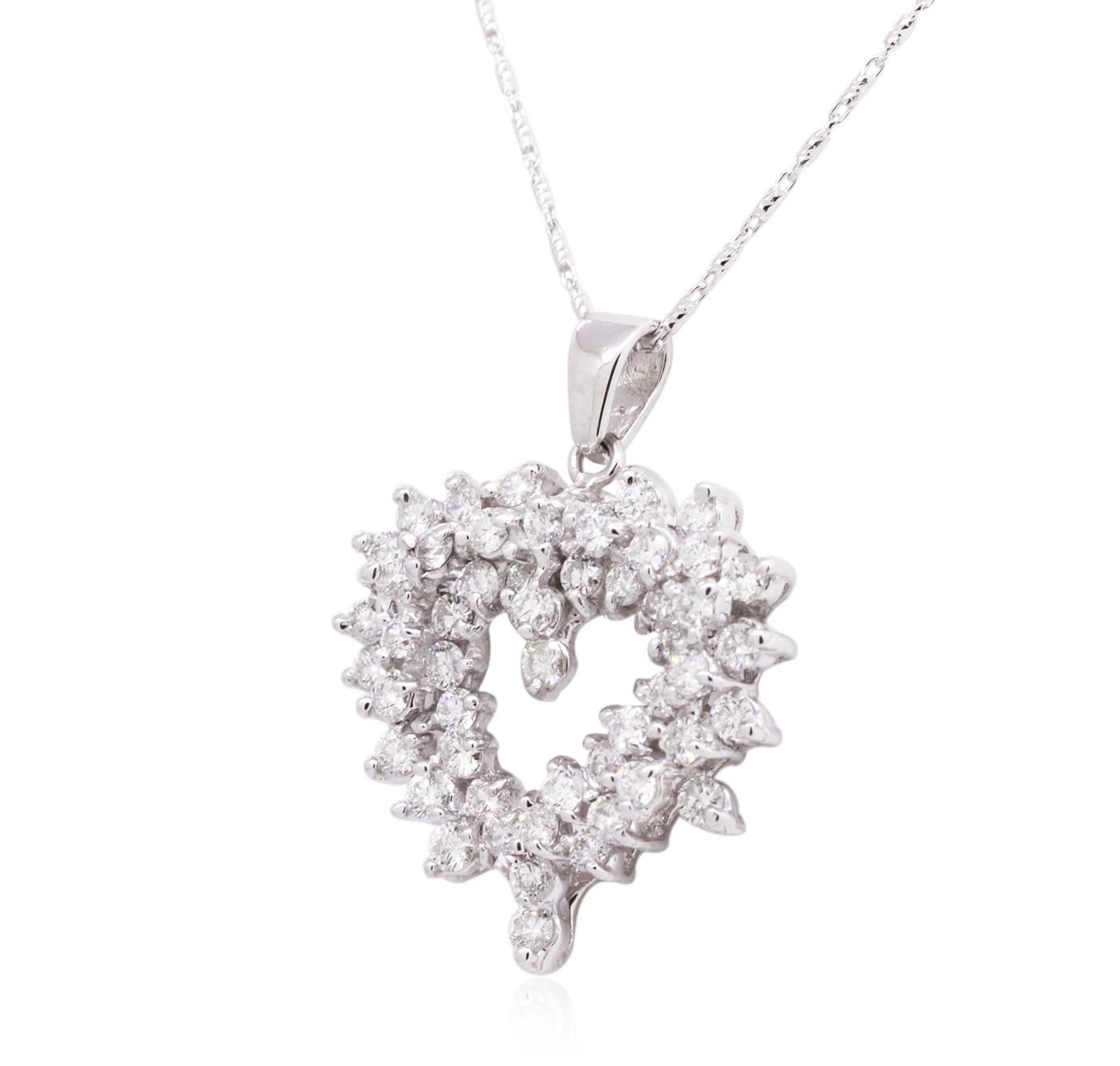 One electronically tested 14KT white gold ladies combination cast & assembled diamond pendant & chain 18.0" long, fancy link with a lobster claw clasp with a bright polish finish. Identified with markings of "14K". Condition is new. Containing: Forty-Four prong set round brilliant cut diamonds, measuring 2.50 - 2.00 x 1.35mm (depth est.) approximate total weight of 44 Stones = 1.83ct. Clarity: SI-2 to I-1. Color: J - K, Cut is Good. All diamonds are graded in the mounting, unless otherwise stated. Total Weight of Diamonds 1.83ct. Total Weight of Pendant & Chain 12.80 grams. GGL Appraised at $7,875.00.