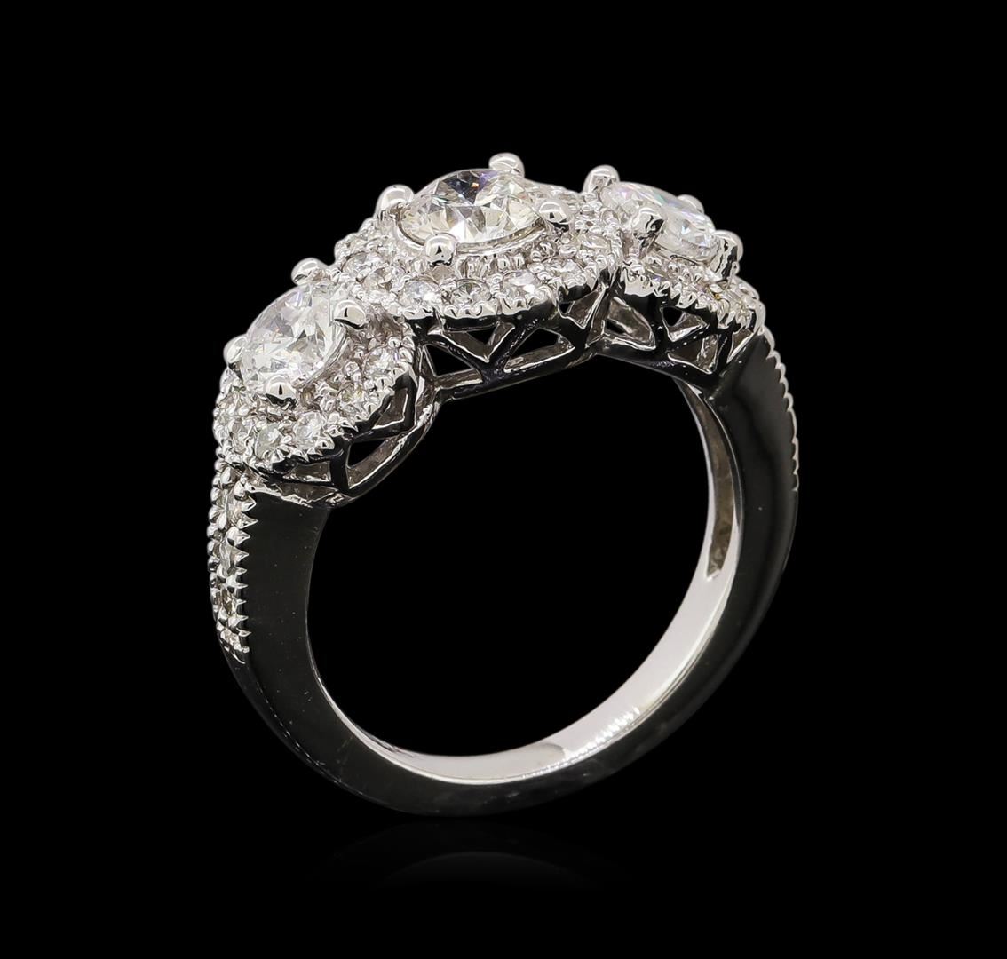 One electronically tested 14KT white gold ladies combination cast & assembled diamond engagement ring with a bright polish finish. Identified with markings of "14K". Condition is new. Containing: One prong set round brilliant cut diamond, measuring 5.50 - 5.50 x 3.30mm (depth est.) approximate weight of 0.61ct. Clarity: I-2. Color: I, Cut is Good. Two prong set round brilliant cut diamonds, measuring 5.00 - 5.00 x 3.00mm (depth est.) approximate total weight of 2 Stones = 0.92ct. Clarity: I-1. Color: H, Cut is Good. Thirty-Eight prong set round brilliant cut diamonds, measuring 1.30 - 1.30 x 0.78mm (depth est.) approximate total weight of 38 Stones = 0.30ct. Clarity: SI-2 to I-1. Color: H - I, Cut is Good. All diamonds are graded in the mounting, unless otherwise stated. Total Weight of Diamonds 1.83ct. Total Weight of Engagement Ring 6.20 grams. GGL Appraised at $7,505.00.