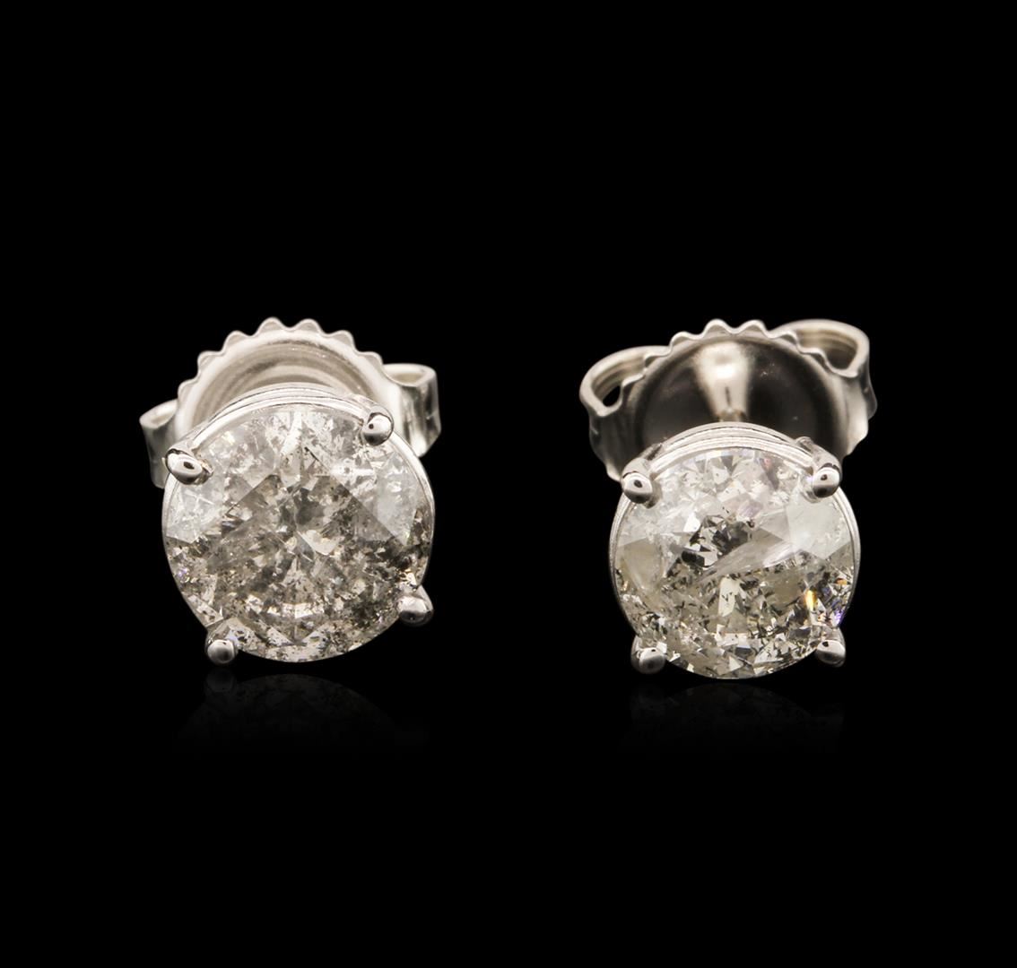 One pair electronically tested 14KT white gold ladies cast diamond stud earrings with friction posts with a bright polish finish. Condition is new. Containing: One prong set round brilliant cut diamond, measuring 6.60 - 6.55 x 3.95mm (depth est.) approximate weight of 1.04ct. Clarity: I-3. Color: I, Cut is Good. One prong set round brilliant cut diamond, measuring 5.99 - 5.99 x 3.59mm (depth est.) approximate weight of 0.79ct. Clarity: I-3. Color: I, Cut is Good. All diamonds are graded in the mounting, unless otherwise stated. Total Weight of Diamonds 1.83ct. Total Weight of Stud Earrings 1.50 grams. GGL Appraised at $5,335.00.