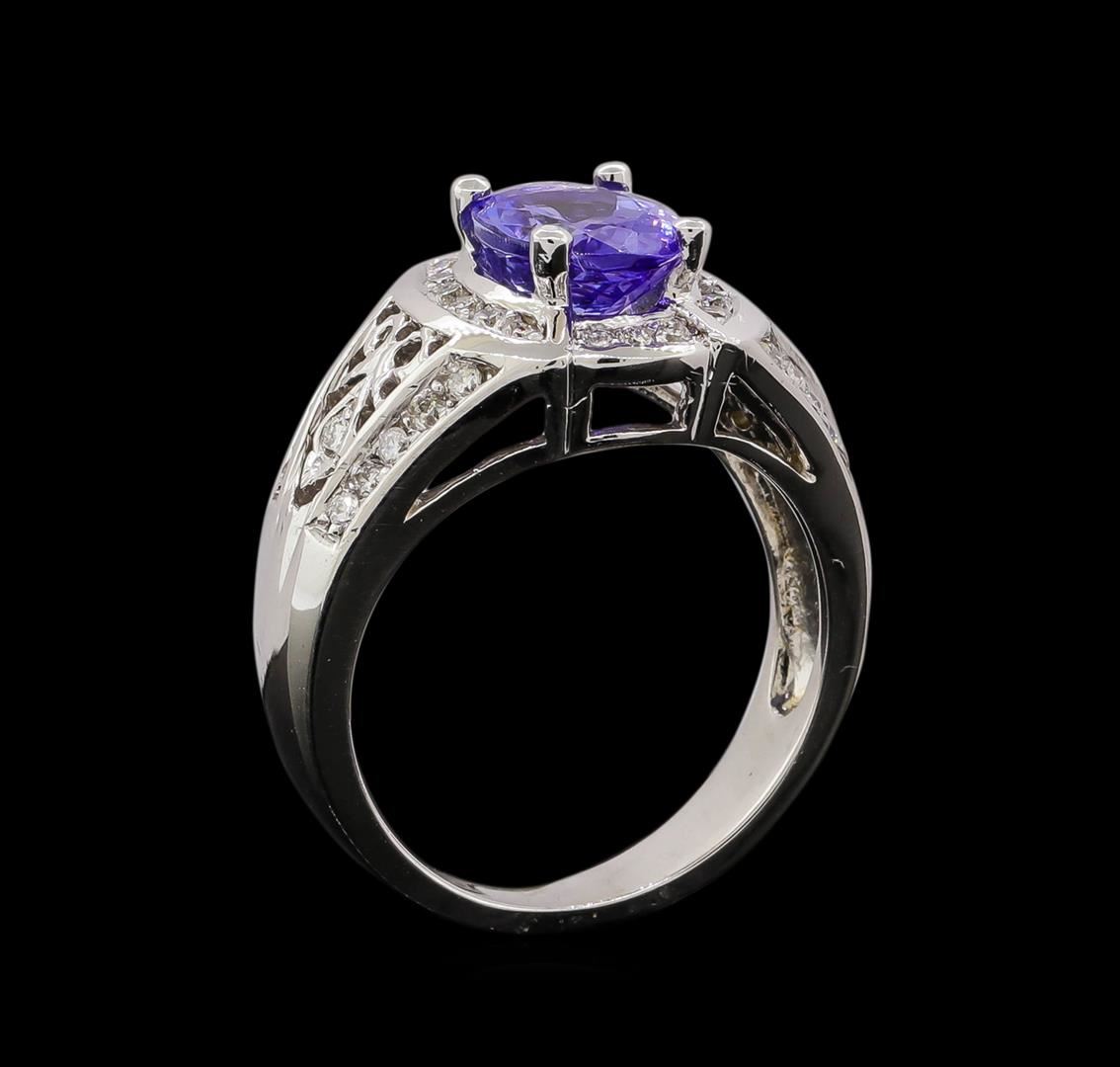 One electronically tested 14KT white gold ladies cast tanzanite and diamond ring with a bright polish finish. Identified with markings of "14KT". Condition is new. Containing: One prong set oval modified brilliant cut natural tanzanite, measuring 9.20 x 6.60 x 4.29mm, approximate weight of 1.83ct., clarity is eye clean, type I, medium light, very slightly grayish, violet color, (GIA V 4/3), cut is very good. Forty-One prong set round brilliant cut diamonds, measuring 1.30 - 1.30 x 0.78mm (depth est.) approximate total weight of 41 Stones = 0.33ct. Clarity: SI-1 to SI-2. Color: I - J, Cut is Good. Colored gemstones are presumed to have been subjected to commonly used enhancement processes. All diamonds and colored gemstones are graded in the mounting, unless otherwise stated. Total Weight of Colored Stones 1.83ct. Total Weight of Diamonds 0.33ct. Total Weight of Ring 7.00 grams. GGL Appraised at $4,090.00.