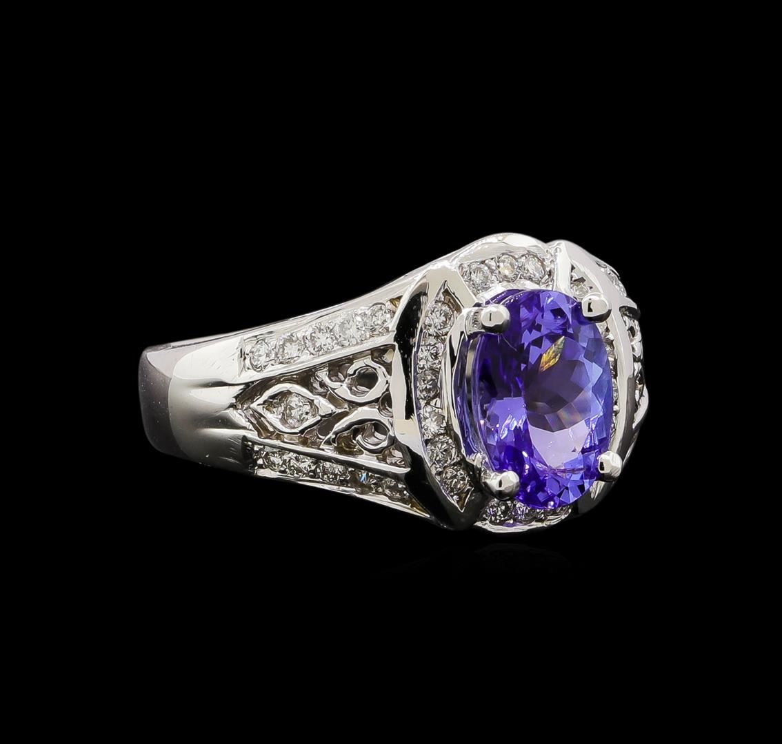 One electronically tested 14KT white gold ladies cast tanzanite and diamond ring with a bright polish finish. Identified with markings of "14KT". Condition is new. Containing: One prong set oval modified brilliant cut natural tanzanite, measuring 9.20 x 6.60 x 4.29mm, approximate weight of 1.83ct., clarity is eye clean, type I, medium light, very slightly grayish, violet color, (GIA V 4/3), cut is very good. Forty-One prong set round brilliant cut diamonds, measuring 1.30 - 1.30 x 0.78mm (depth est.) approximate total weight of 41 Stones = 0.33ct. Clarity: SI-1 to SI-2. Color: I - J, Cut is Good. Colored gemstones are presumed to have been subjected to commonly used enhancement processes. All diamonds and colored gemstones are graded in the mounting, unless otherwise stated. Total Weight of Colored Stones 1.83ct. Total Weight of Diamonds 0.33ct. Total Weight of Ring 7.00 grams. GGL Appraised at $4,090.00.