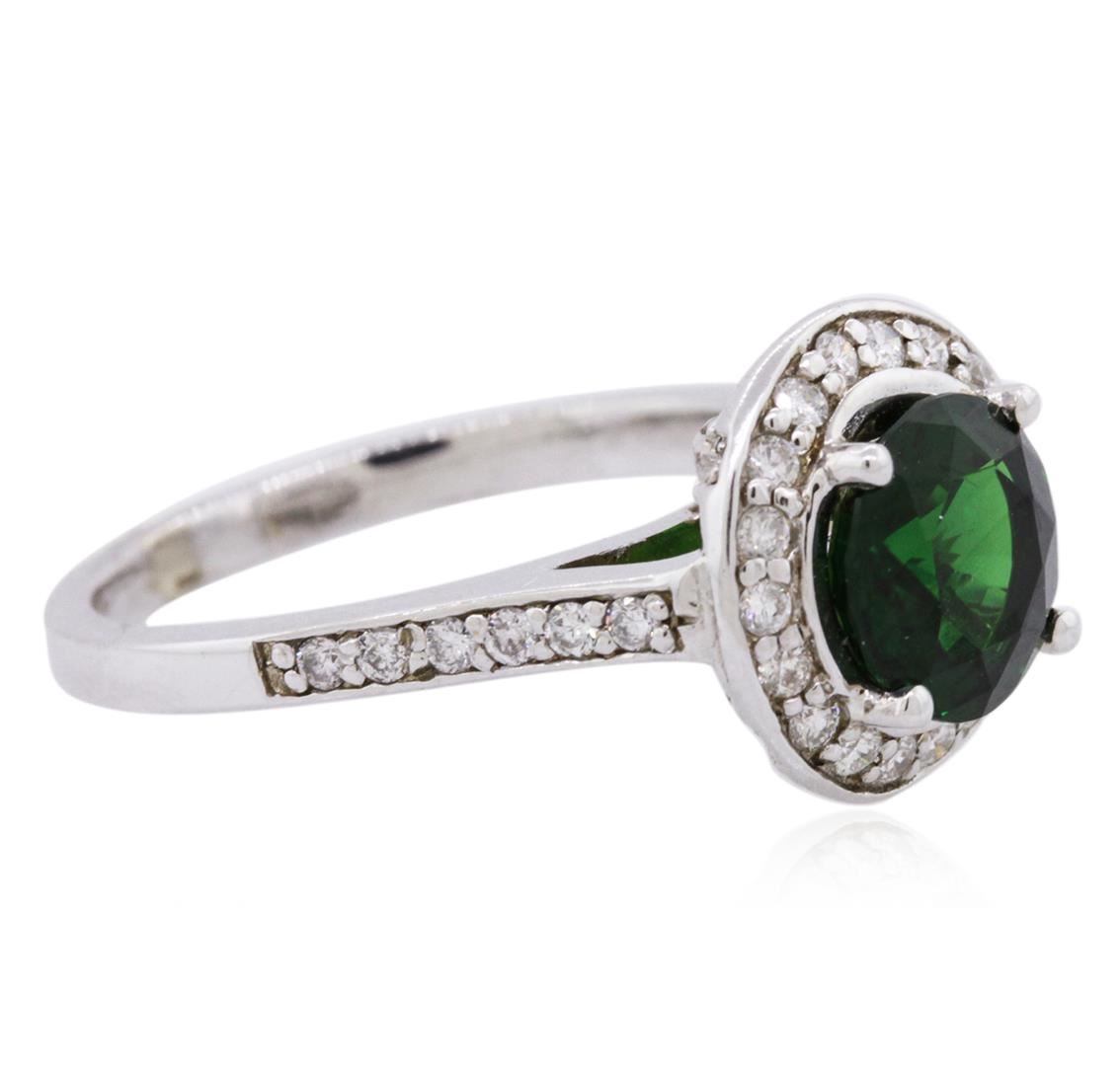 One electronically tested 14KT white gold ladies cast green tourmaline and diamond ring with a bright polish finish. The featured green tourmaline is set within a diamond bezel supported by diamond set under gallery and diamond set shoulders, completed by a two millimeter wide band. Identified with markings of "14K". Condition is new, good workmanship. Containing: One prong set round brilliant cut natural green tourmaline, measuring 7.85 - 7.80 x 4.50 mm, 8%. bulge factor, approximate weight of 1.83ct., clarity is eye clean, type I, dark, very slightly grayish, green color, (GIA G 7/3), cut is good. Transmitting light with no distortion, transparent. Refractive index testing results of 1.62 to 1.64. Thisis a conclusive result for tourmaline. Graded in the setting. Forty-Four prong set round brilliant cut diamonds, measuring 1.50 - 1.40 x 0.87mm (depth est.) approximate total weight of 44 Stones = 0.58ct. Clarity: SI-1 to I-1. Color: G - I. Total Weight of Colored Stones 1.83ct. Total Weight of Diamonds 0.58ct. Total Weight of Ring 5.20 grams. AIG Appraised at $1,485.00.