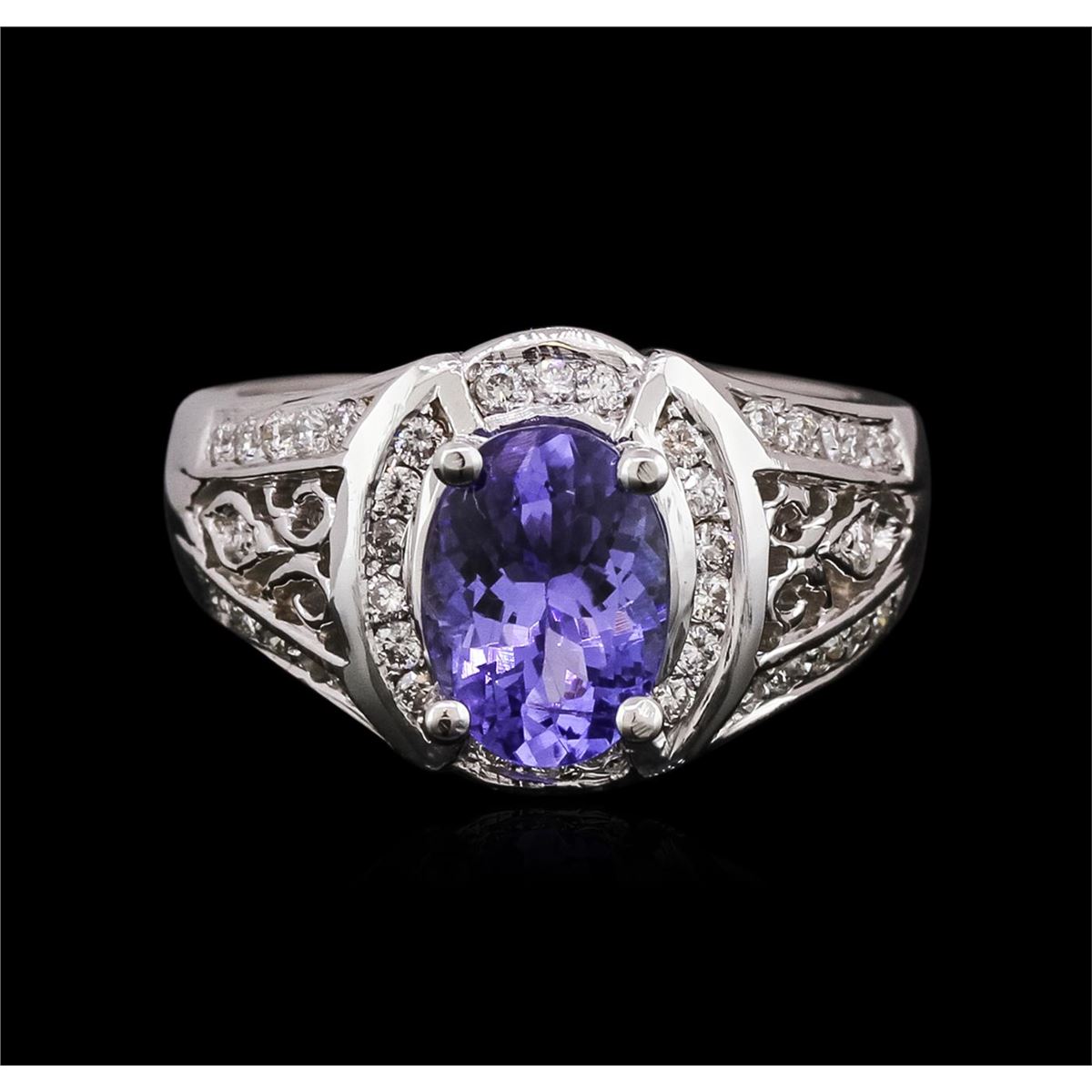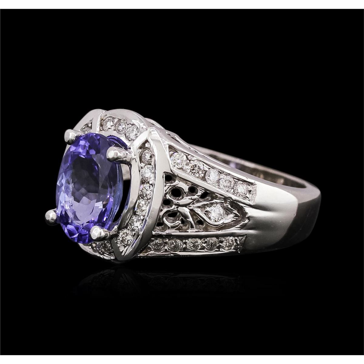 One electronically tested 14KT white gold ladies cast tanzanite and diamond ring with a bright polish finish. Identified with markings of "14KT". Condition is new. Containing: One prong set oval modified brilliant cut natural tanzanite, measuring 9.20 x 6.60 x 4.29mm, approximate weight of 1.83ct., clarity is eye clean, type I, medium light, very slightly grayish, violet color, (GIA V 4/3), cut is very good. Forty-One prong set round brilliant cut diamonds, measuring 1.30 - 1.30 x 0.78mm (depth est.) approximate total weight of 41 Stones = 0.33ct. Clarity: SI-1 to SI-2. Color: I - J, Cut is Good. Colored gemstones are presumed to have been subjected to commonly used enhancement processes. All diamonds and colored gemstones are graded in the mounting, unless otherwise stated. Total Weight of Colored Stones 1.83ct. Total Weight of Diamonds 0.33ct. Total Weight of Ring 7.00 grams. GGL Appraised at $4,090.00.