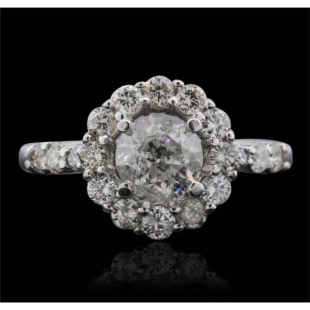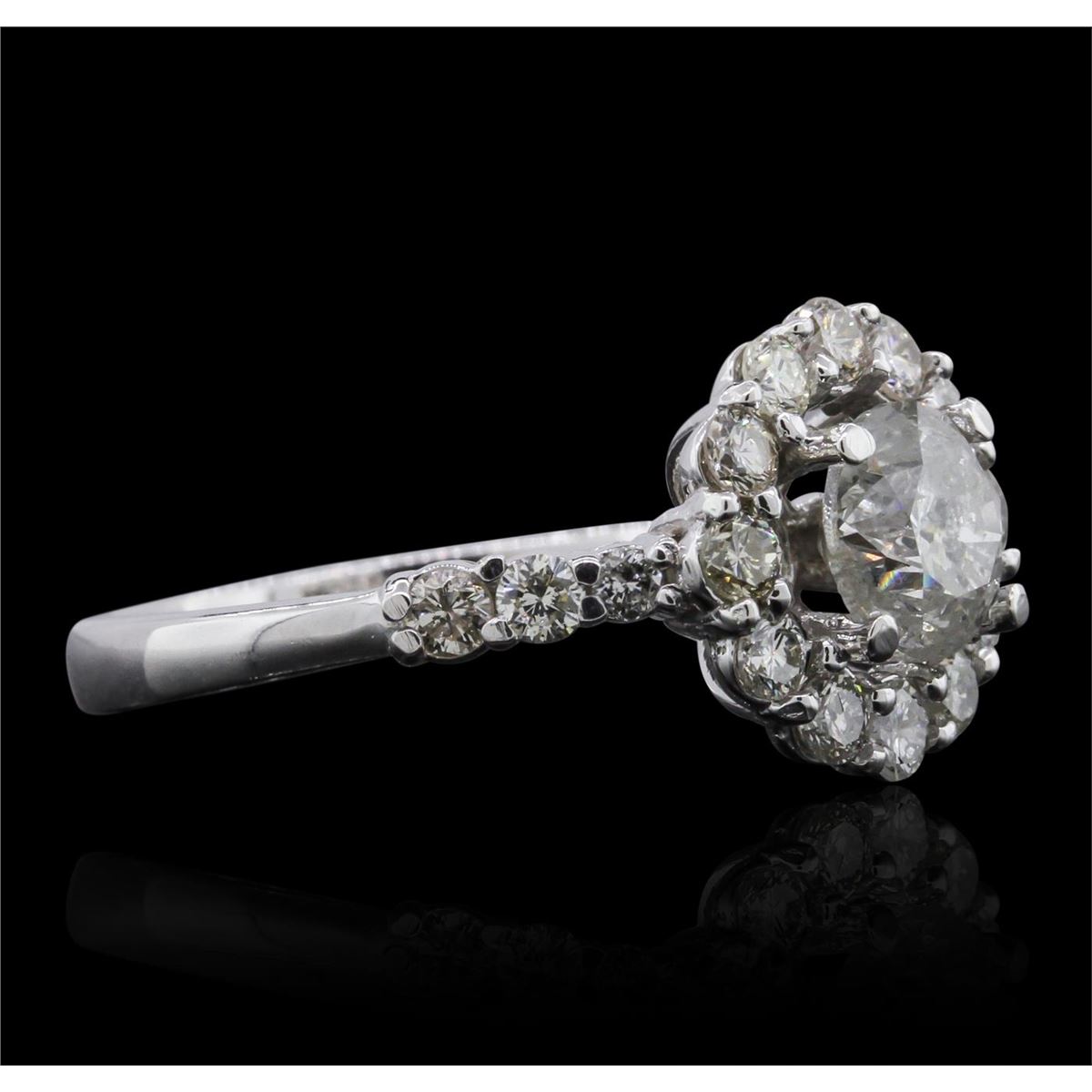 One electronically tested 14KT white gold ladies cast diamond unity ring with a bright polish finish. Condition is new, good workmanship. The featured diamond is set within a diamond bezel supported by diamond set shoulders, completed by a two and one-half millimeter wide band. Identified with markings of "585". Containing: One prong set round brilliant cut diamond, measuring 6.15 - 6.10 x 4.10mm (depth est.), 5.00.%. GTCF approximate weight of 1.10ct. Graded in the setting. Clarity: I-2. Color: JDepth 66.9%. Table 57.1%. Eighteen prong set round brilliant cut diamonds, measuring 2.50 - 1.80 x 1.29mm (depth est.) approximate. Total Weight of 18 Stones = 0.73ct. Graded in the setting. Clarity: I-1 to I-2. Color: I - K. Total Weight of Diamonds 1.83ct. Total Weight of Ring 3.96 grams. AIG Appraised at $10,635.00.