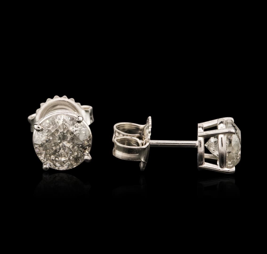 One pair electronically tested 14KT white gold ladies cast diamond stud earrings with friction posts with a bright polish finish. Condition is new. Containing: One prong set round brilliant cut diamond, measuring 6.60 - 6.55 x 3.95mm (depth est.) approximate weight of 1.04ct. Clarity: I-3. Color: I, Cut is Good. One prong set round brilliant cut diamond, measuring 5.99 - 5.99 x 3.59mm (depth est.) approximate weight of 0.79ct. Clarity: I-3. Color: I, Cut is Good. All diamonds are graded in the mounting, unless otherwise stated. Total Weight of Diamonds 1.83ct. Total Weight of Stud Earrings 1.50 grams. GGL Appraised at $5,335.00.