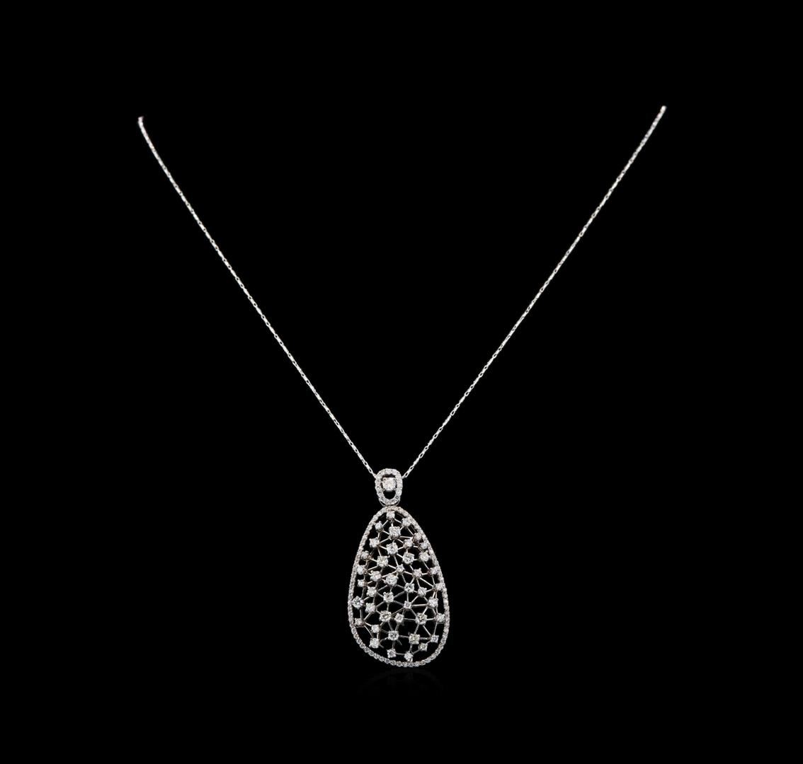 One electronically tested 14KT white gold ladies cast diamond pendant & chain 18.0" long, with a lobster claw clasp with a bright polish finish. Identified with markings of "14K". Condition is new. Containing: One prong set round brilliant cut diamond, measuring 3.00. - 3.00. x 1.80mm (depth est.) approximate weight of 0.10ct. Clarity: I-2. Color: I. Thirty-Five prong set round brilliant cut diamonds, measuring 2.50 - 1.50 x 1.20mm (depth est.) approximate total weight of 35 Stones = 1.02ct. Clarity: SI-1 to I-1. Color: I - J. One Hundred Fourteen prong set round brilliant cut diamonds, measuring 1.20 - 1.20 x 0.72mm (depth est.) approximate total weight of 114 Stones = 0.72ct. Clarity: I-1 to I-2. Color: I - J. All diamonds are graded in the mounting, unless otherwise stated. Total Weight of Diamonds 1.84ct. Total Weight of Pendant & Chain 10.40 grams. GGL Appraised at $6,265.00.