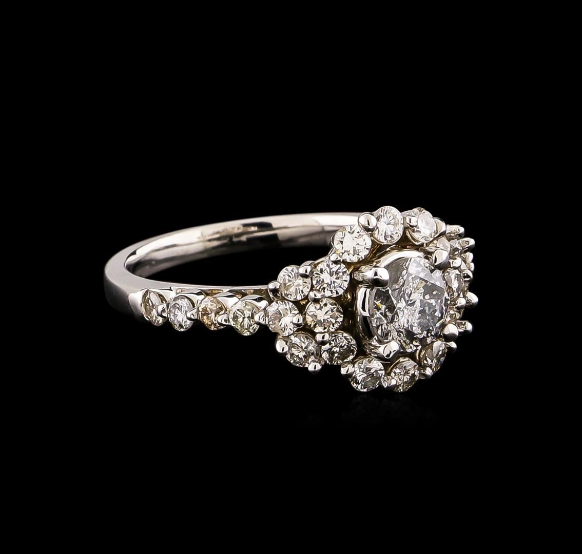 One electronically tested 14KT white gold ladies cast diamond ring with a bright polish finish. Condition is new, good workmanship. The featured diamond is set within a stylized diamond bezel supported by diamond set shoulders, completed by a two millimeter wide band. Identified with markings of "K14". Containing: One prong set round brilliant cut diamond, measuring 5.60 - 5.50 x 3.50mm (depth est.) approximate weight of 0.74ct. Faint secondary color throughout. Graded in the setting. Clarity: SI-3. Color: 63.1%. Table 64.0%. Twenty-Six prong set round brilliant cut diamonds, measuring 2.20 - 2.10 x 1.29mm (depth est.) approximate. Total Weight of 26 Stones = 1.10ct. Graded in the setting. Clarity: SI-1 to I-1. Color: H - J. Total Weight of Diamonds 1.84ct. Total Weight of Ring 4.62 grams. AIG Appraised at $8,980.00.