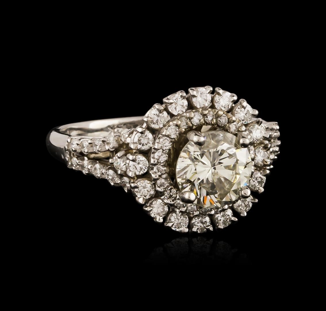 One electronically tested 14KT white gold ladies cast diamond unity ring with a bright polish finish. The featured diamond is set within tiered diamond bezels supported by diamond set split shoulders, completed by a two millimeter wide band. Identified with markings of "14K". Condition is new, good workmanship. Containing: One prong set round brilliant cut diamond, measuring 6.80 - 6.78 x 3.90mm (depth est.) approximate weight of 1.09ct with a medium blue fluorescence. Naturally occurring internal & external characteristics are present, including feathers. Graded in the setting. Clarity: I-2. Color: L. Depth 57.4%. Table 61.9%. Eighteen prong set round brilliant cut diamonds, measuring 1.90 - 1.80 x 1.11mm (depth est.) approximate total weight of 18 Stones = 0.45ct. Graded in the setting. Clarity: SI-2 to I-1. Color: H - J Forty-One prong set round brilliant cut diamonds, measuring 1.30 - 1.10 x 0.72mm (depth est.) approximate total weight of 41 Stones = 0.30ct. Graded in the setting. Clarity: SI-2 to I-1. Color: H - J. Total Weight of Diamonds 1.84ct. Total Weight of Ring 4.20 grams. AIG Appraised at $9,330.00.
