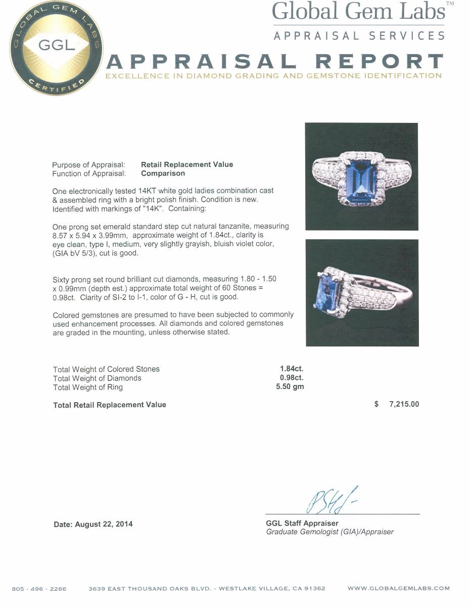 One electronically tested 14KT white gold ladies combination cast & assembled ring with a bright polish finish. Identified with markings of "14K". Condition is new. Containing: One prong set emerald standard step cut natural tanzanite, measuring 8.57 x 5.94 x 3.99mm, approximate weight of 1.84ct., clarity is eye clean, type I, medium, very slightly grayish, bluish violet color, (GIA bV 5/3), cut is good. Sixty prong set round brilliant cut diamonds, measuring 1.80 - 1.50 x 0.99mm (depth est.) approximate total weight of 60 Stones = 0.98ct. Clarity: SI-2 to I-1. Color: G - H, Cut is Good. Colored gemstones are presumed to have been subjected to commonly used enhancement processes. All diamonds and colored gemstones are graded in the mounting, unless otherwise stated. Total Weight of Colored Stones 1.84ct. Total Weight of Diamonds 0.98ct. Total Weight of Ring 5.50 grams. GGL Appraised at $7,215.00.