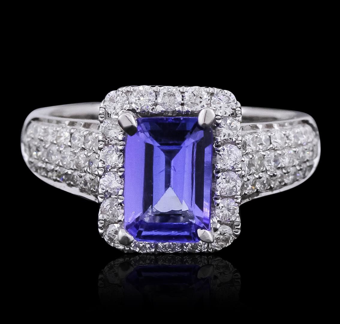 One electronically tested 14KT white gold ladies combination cast & assembled ring with a bright polish finish. Identified with markings of "14K". Condition is new. Containing: One prong set emerald standard step cut natural tanzanite, measuring 8.57 x 5.94 x 3.99mm, approximate weight of 1.84ct., clarity is eye clean, type I, medium, very slightly grayish, bluish violet color, (GIA bV 5/3), cut is good. Sixty prong set round brilliant cut diamonds, measuring 1.80 - 1.50 x 0.99mm (depth est.) approximate total weight of 60 Stones = 0.98ct. Clarity: SI-2 to I-1. Color: G - H, Cut is Good. Colored gemstones are presumed to have been subjected to commonly used enhancement processes. All diamonds and colored gemstones are graded in the mounting, unless otherwise stated. Total Weight of Colored Stones 1.84ct. Total Weight of Diamonds 0.98ct. Total Weight of Ring 5.50 grams. GGL Appraised.