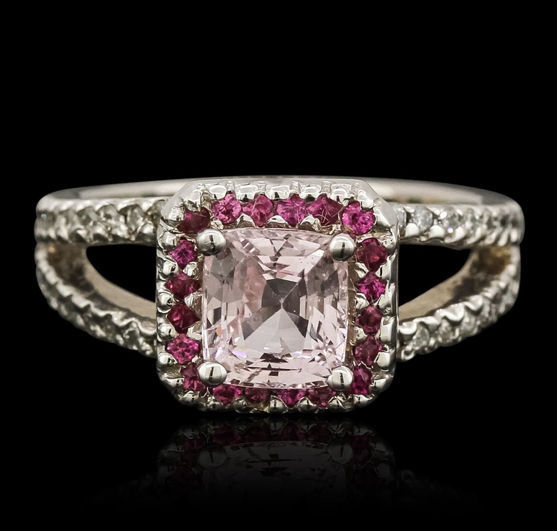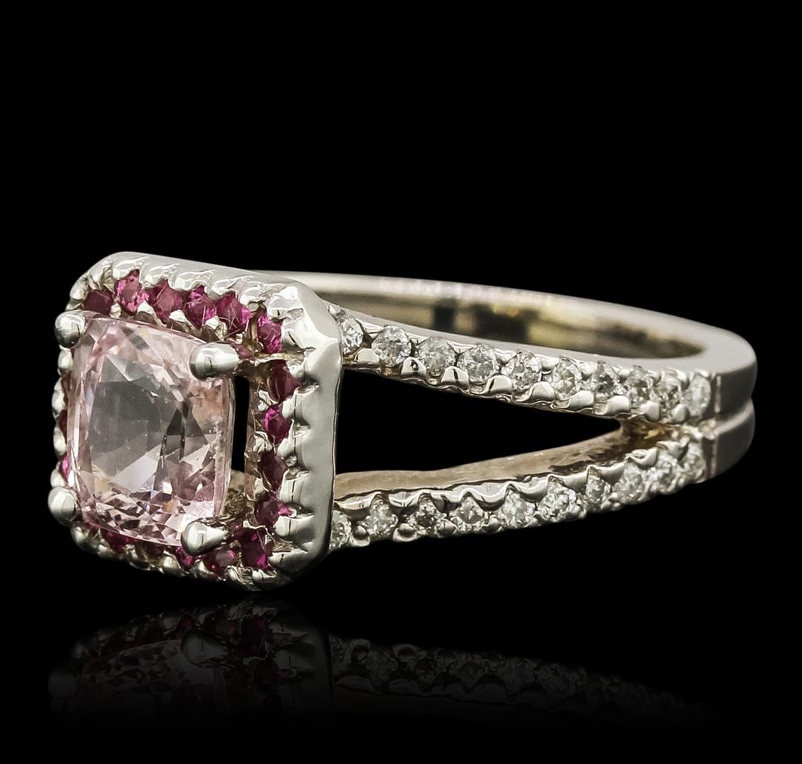 One electronically tested 14KT white gold ladies cast pink sapphire, ruby and diamond ring with a bright polish finish. The featured pink sapphire is set within a ruby bezel supported by diamond set split shoulders, completed by a grooved two and one-half millimeter wide band. Identified with markings of "14K". Condition is good. Containing: One prong set rectangular cushion mixed cut natural pink sapphire, measuring 6.90 x 6.15 x 4.35mm, 6%. bulge factor, approximate weight of 1.84ct., clarity is slightly included, extremely light, very slightly grayish, pink color, (GIA Pk 1/3), cut is good. Transmitting light with a minimum of distortion, transparent. Naturally occurring internal & external characteristics are present. Graded in the setting. Twenty prong set round mixed cut natural rubies, measuring 1.40 - 1.30 x 0.88 mm, 8%. bulge factor, approximate. Total Weight of 0.30ct., clarity is eye clean, type II, medium dark, very slightly brownish, strongly purplish red color, (GIA stpR 6/3), cut is good. Transmitting light with no distortion, transparent. Color grade is an average for the group. Graded in the setting. Forty prong set round brilliant cut diamonds, measuring 1.40 - 1.30 x 0.81mm (depth est.) approximate. Total Weight of 40 Stones = 0.46ct. Graded in the setting. Clarity: SI-1 to I-1. Color: G - I. Total Weight of Colored Stones 2.14ct. Total Weight of Diamonds 0.46ct. Total Weight of Ring 6.84gm. AIG Appraised at $3,880.00.