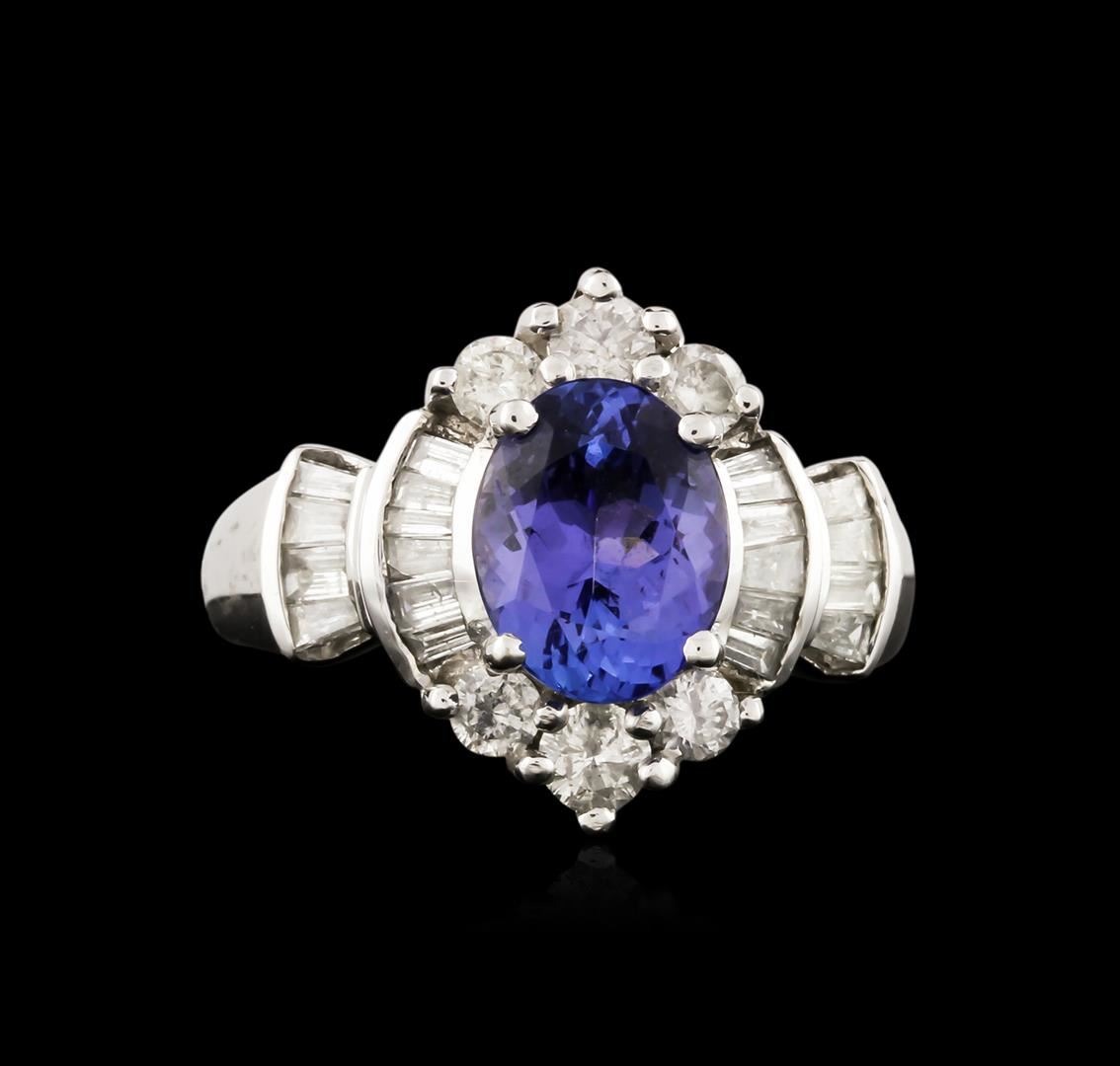 One electronically tested 14KT white gold ladies cast tanzanite and diamond ring with a bright polish finish. The featured tanzanite is set within a stylized diamond bezel supported by diamond set shoulders, completed by a one and one-half millimeter wide band. Identified with markings of "14K". Condition is new, good workmanship. Containing: One prong set oval mixed cut natural tanzanite, measuring 8.85 x 6.95 x 4.15mm, 6%. bulge factor, approximate weight of 1.84ct., clarity is eye clean, type I, medium dark, very slightly grayish, bluish violet color, (GIA bV 6/3), cut is good. Transmitting light with no distortion, transparent. Graded in the setting. Tanzanite is a very rare gemstone that is only found in the country of Tanzania. Originally discovered in 1967. Tiffany & Company, named the stone Tanzanite. It is found in the Usumburu Mountains that border the Umba Valley of northern Tanzania. Tanzanite occurs in gray, brown, violet, blue, reddish-purple, & green. The gem is interesting because of its exceptional pleochroism. Rotated in different directions a tanzanite will exhibit multiple changes of color. Tanzanite has a low tolerance to ultrasonic cleaning, and should not be cleaned using this method. Six prong set round brilliant cut diamonds, measuring 3.00 - 2.50 x 1.65mm (depth est.) approximate total weight of 6 Stones = 0.45ct. Graded in the setting. Clarity: I-1 to I-2. Color: H - I Twenty channel set baguette cut (tapered) diamonds, measuring from 2.20 x 1.10 x 0.77mm (depth est.) to 2.40 x 1.30 x 0.91mm (depth est.) approximate total weight of 20 Stones = 0.42ct. Graded in the setting. Clarity: I-1 to I-2. Color: H - J. Total Weight of Colored Stones 1.84ct. Total Weight of Diamonds 0.87ct. Total Weight of Ring 4.58 grams. AIG Appraised at $5,770.00.