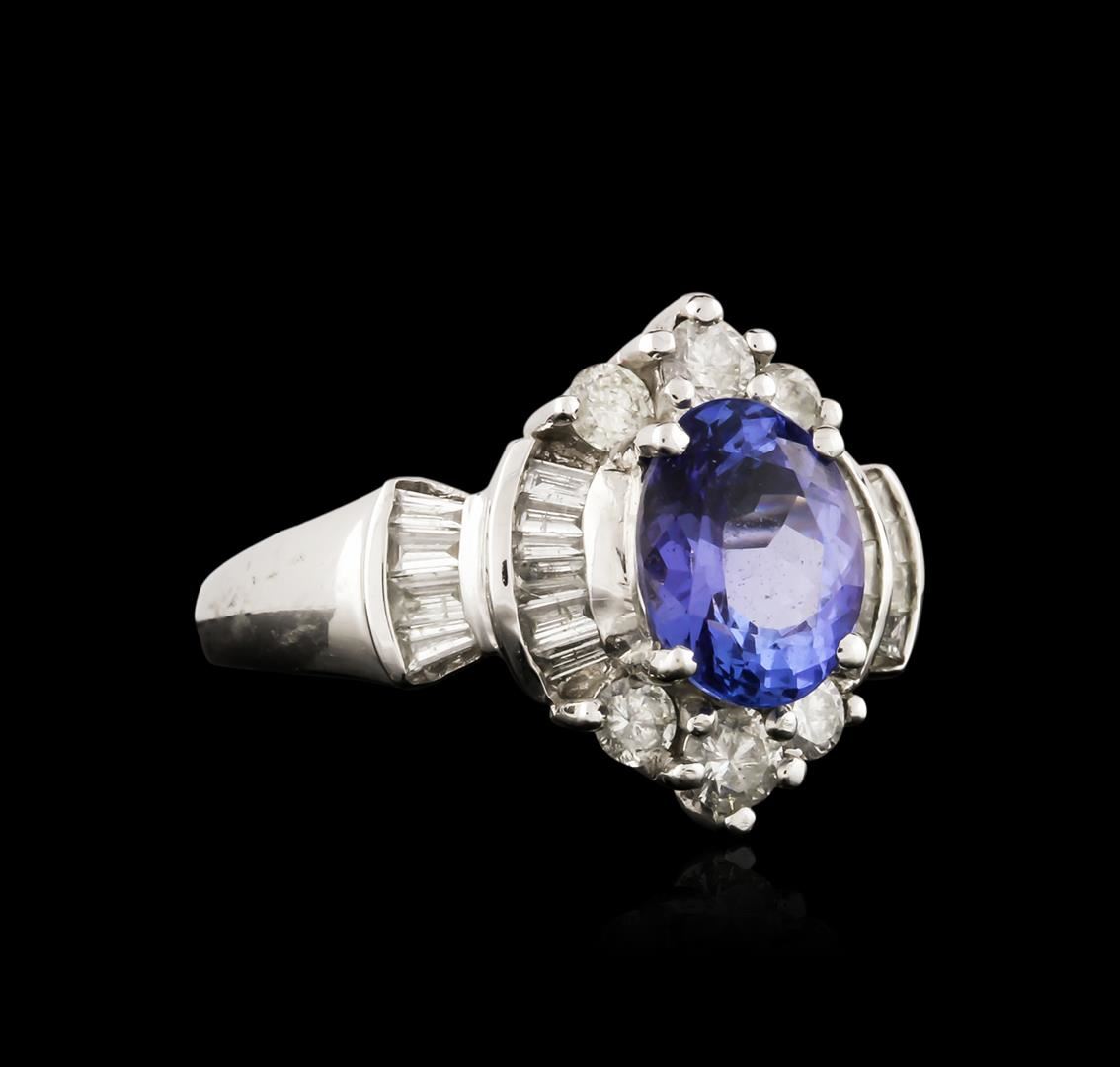 One electronically tested 14KT white gold ladies cast tanzanite and diamond ring with a bright polish finish. The featured tanzanite is set within a stylized diamond bezel supported by diamond set shoulders, completed by a one and one-half millimeter wide band. Identified with markings of "14K". Condition is new, good workmanship. Containing: One prong set oval mixed cut natural tanzanite, measuring 8.85 x 6.95 x 4.15mm, 6%. bulge factor, approximate weight of 1.84ct., clarity is eye clean, type I, medium dark, very slightly grayish, bluish violet color, (GIA bV 6/3), cut is good. Transmitting light with no distortion, transparent. Graded in the setting. Tanzanite is a very rare gemstone that is only found in the country of Tanzania. Originally discovered in 1967. Tiffany & Company, named the stone Tanzanite. It is found in the Usumburu Mountains that border the Umba Valley of northern Tanzania. Tanzanite occurs in gray, brown, violet, blue, reddish-purple, & green. The gem is interesting because of its exceptional pleochroism. Rotated in different directions a tanzanite will exhibit multiple changes of color. Tanzanite has a low tolerance to ultrasonic cleaning, and should not be cleaned using this method. Six prong set round brilliant cut diamonds, measuring 3.00 - 2.50 x 1.65mm (depth est.) approximate total weight of 6 Stones = 0.45ct. Graded in the setting. Clarity: I-1 to I-2. Color: H - I Twenty channel set baguette cut (tapered) diamonds, measuring from 2.20 x 1.10 x 0.77mm (depth est.) to 2.40 x 1.30 x 0.91mm (depth est.) approximate total weight of 20 Stones = 0.42ct. Graded in the setting. Clarity: I-1 to I-2. Color: H - J. Total Weight of Colored Stones 1.84ct. Total Weight of Diamonds 0.87ct. Total Weight of Ring 4.58 grams. AIG Appraised at $5,770.00.