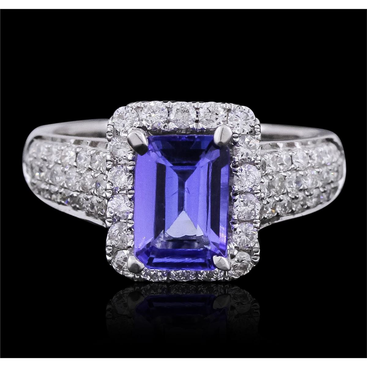 One electronically tested 14KT white gold ladies combination cast & assembled ring with a bright polish finish. Identified with markings of "14K". Condition is new. Containing: One prong set emerald standard step cut natural tanzanite, measuring 8.57 x 5.94 x 3.99mm, approximate weight of 1.84ct., clarity is eye clean, type I, medium, very slightly grayish, bluish violet color, (GIA bV 5/3), cut is good. Sixty prong set round brilliant cut diamonds, measuring 1.80 - 1.50 x 0.99mm (depth est.) approximate total weight of 60 Stones = 0.98ct. Clarity: SI-2 to I-1. Color: G - H, Cut is Good. Colored gemstones are presumed to have been subjected to commonly used enhancement processes. All diamonds and colored gemstones are graded in the mounting, unless otherwise stated. Total Weight of Colored Stones 1.84ct. Total Weight of Diamonds 0.98ct. Total Weight of Ring 5.50 grams. GGL Appraised at $7,215.00.