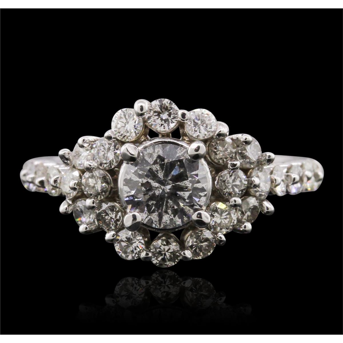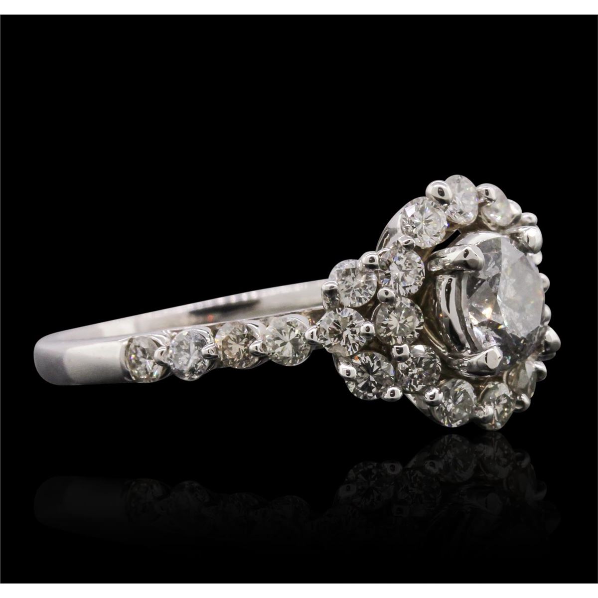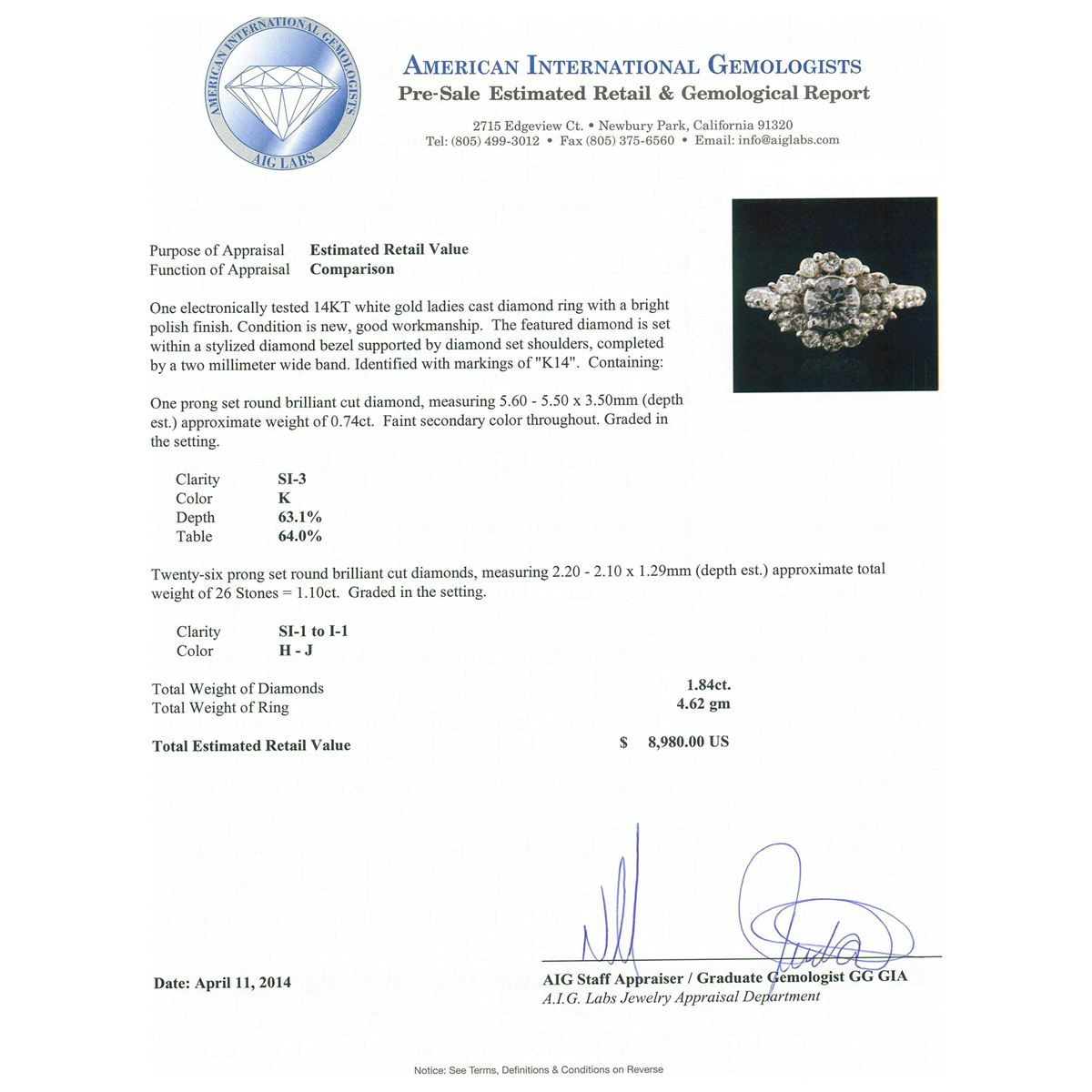 One electronically tested 14KT white gold ladies cast diamond ring with a bright polish finish. Condition is new, good workmanship. The featured diamond is set within a stylized diamond bezel supported by diamond set shoulders, completed by a two millimeter wide band. Identified with markings of "K14". Containing: One prong set round brilliant cut diamond, measuring 5.60 - 5.50 x 3.50mm (depth est.) approximate weight of 0.74ct. Faint secondary color throughout. Graded in the setting. Clarity: SI-3. Color: 63.1%. Table 64.0%. Twenty-Six prong set round brilliant cut diamonds, measuring 2.20 - 2.10 x 1.29mm (depth est.) approximate. Total Weight of 26 Stones = 1.10ct. Graded in the setting. Clarity: SI-1 to I-1. Color: H - J. Total Weight of Diamonds 1.84ct. Total Weight of Ring 4.62 grams. AIG Appraised at $8,980.00.