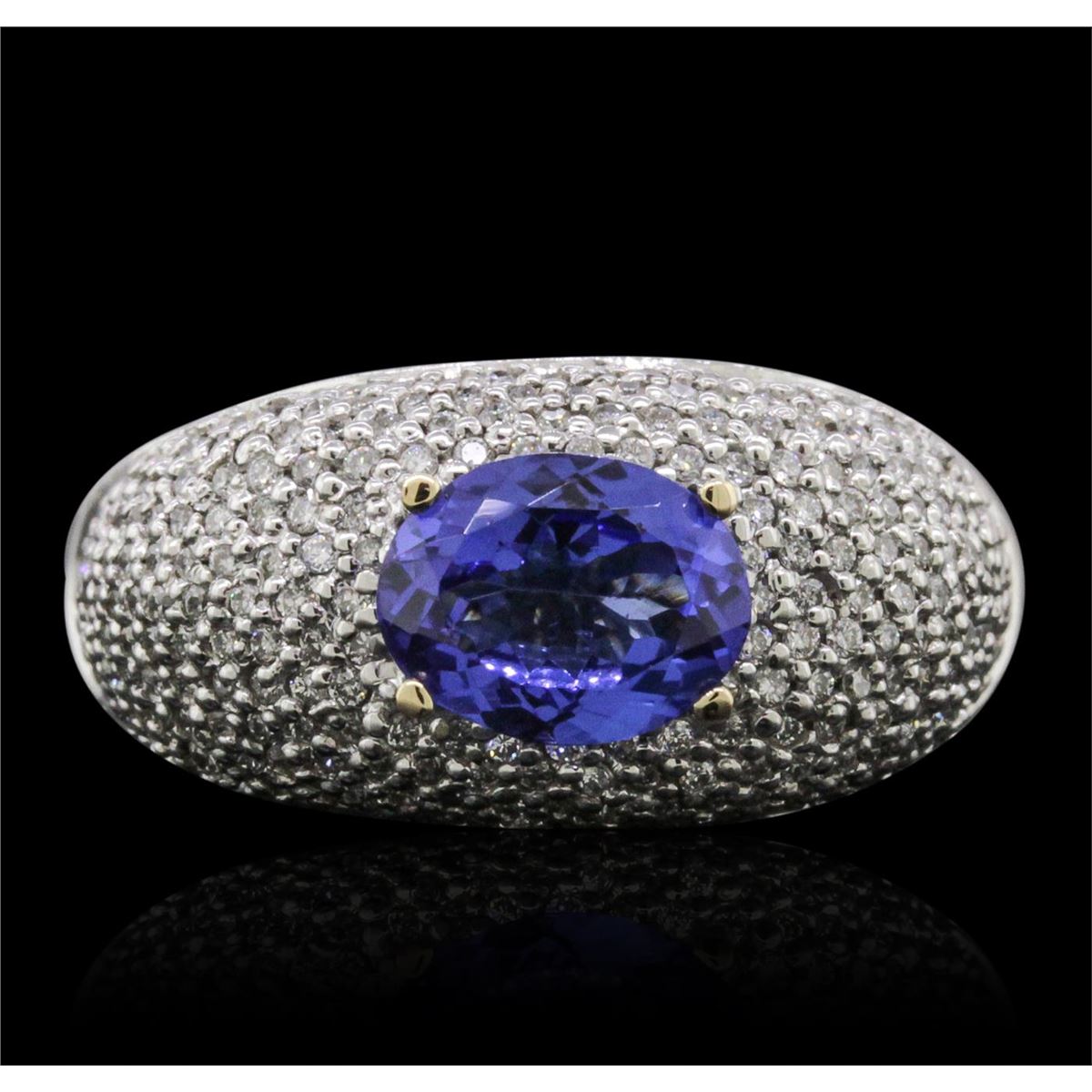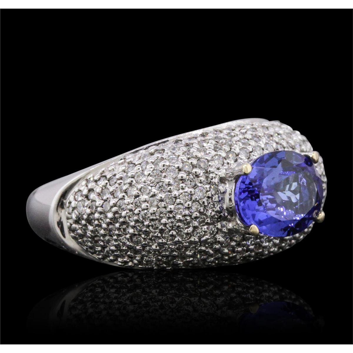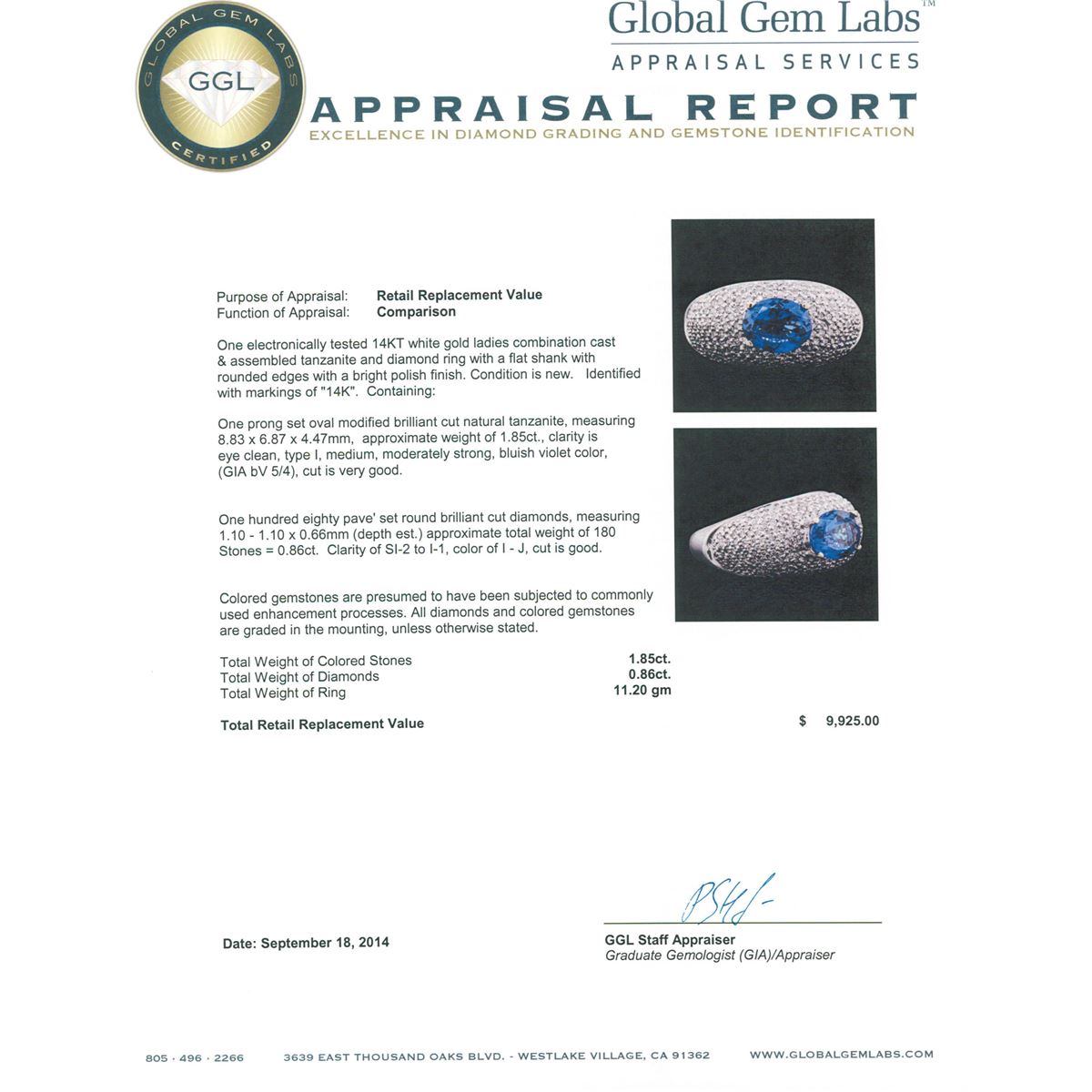 One electronically tested 14KT white gold ladies combination cast & assembled tanzanite and diamond ring with a flat shank with rounded edges with a bright polish finish. Identified with markings of "14K". Condition is new. Containing: One prong set oval modified brilliant cut natural tanzanite, measuring 8.83 x 6.87 x 4.47mm, approximate weight of 1.85ct., clarity is eye clean, type I, medium, moderately strong, bluish violet color, (GIA bV 5/4), cut is very good. One Hundred Eighty pave' set round brilliant cut diamonds, measuring 1.10 - 1.10 x 0.66mm (depth est.) approximate total weight of 180 Stones = 0.86ct. Clarity: SI-2 to I-1. Color: I - J, Cut is Good. Colored gemstones are presumed to have been subjected to commonly used enhancement processes. All diamonds and colored gemstones are graded in the mounting, unless otherwise stated. Total Weight of Colored Stones 1.85ct. Total Weight of Diamonds 0.86ct. Total Weight of Ring 11.20 grams. GGL Appraised at $9,925.00.