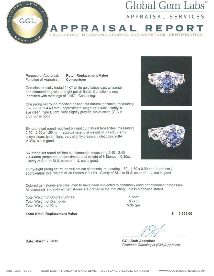 One electronically tested 14KT white gold ladies cast tanzanite and diamond ring with a bright polish finish. Identified with markings of "14K". Condition is new. Containing: One prong set round modified brilliant cut natural tanzanite, measuring 6.90 - 6.90 x 4.49 mm, approximate weight of 1.43ct., clarity is eye clean, type I, light, very slightly grayish, violet color, (GIA V 3/3), cut is good. Six prong set round modified brilliant cut natural tanzanites, measuring 2.50 - 2.50 x 1.63 mm, approximate total weight of 0.42ct., clarity is eye clean, type I, light, very slightly grayish, violet color, (GIA V 3/3), cut is good. Six prong set round brilliant cut diamonds, measuring 2.40 - 2.40 x 1.44mm (depth est.) approximate total weight of 6 Stones = 0.30ct. Clarity: SI-1 to SI-2. Color: I - J, Cut is Good. Thirty-Eight prong set round brilliant cut diamonds, measuring 1.50 - 1.50 x 0.90mm (depth est.) approximate total weight of 38 Stones = 0.47ct. Clarity: SI-1 to SI-2. Color: I - J, Cut is Good. Colored gemstones are presumed to have been subjected to commonly used enhancement processes. All diamonds and colored gemstones are graded in the mounting, unless otherwise stated. Total Weight of Colored Stones 1.85ct. Total Weight of Diamonds 0.77ct. Total Weight of Ring 5.30 grams. GGL Appraised at $3,695.00.