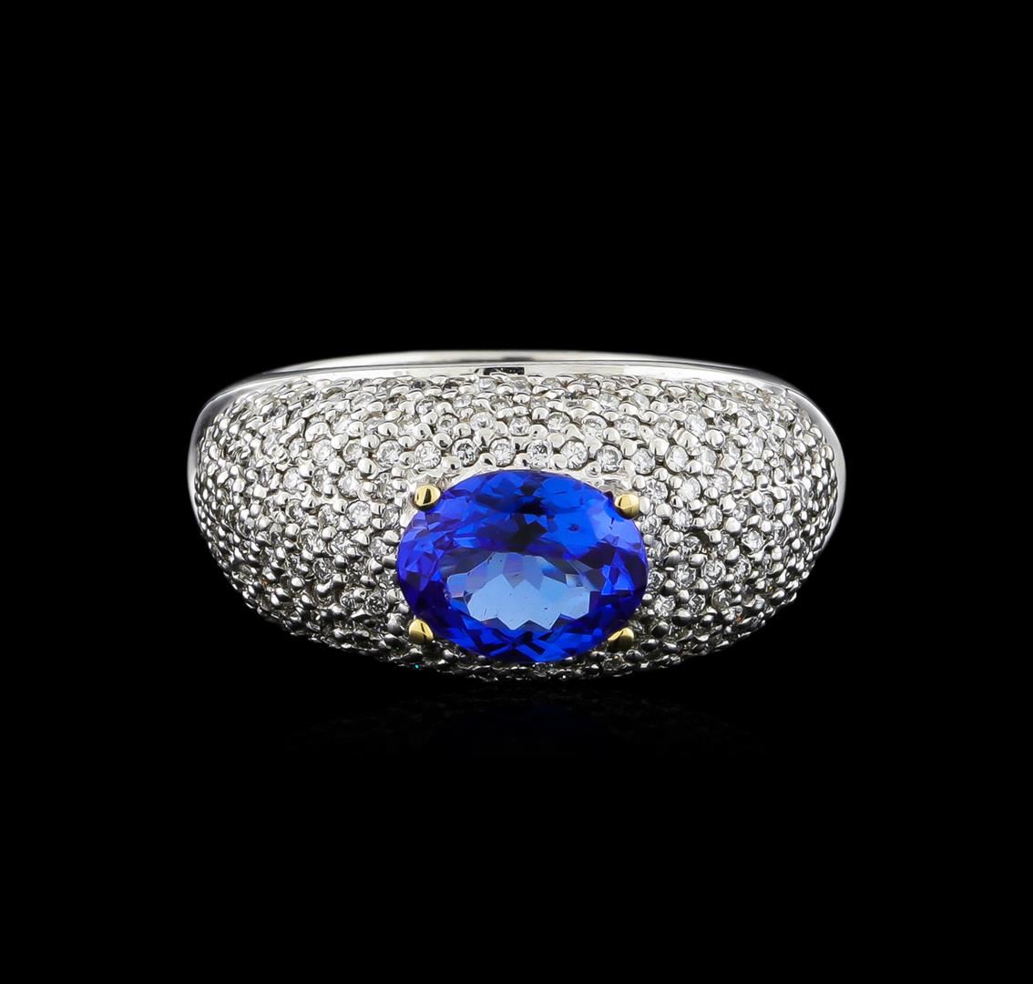 One electronically tested 14KT white gold ladies combination cast & assembled tanzanite and diamond ring with a flat shank with rounded edges with a bright polish finish. Identified with markings of "14K". Condition is new. Containing: One prong set oval modified brilliant cut natural tanzanite, measuring 8.83 x 6.87 x 4.47mm, approximate weight of 1.85ct., clarity is eye clean, type I, medium, moderately strong, bluish violet color, (GIA bV 5/4), cut is very good. One Hundred Eighty pave' set round brilliant cut diamonds, measuring 1.10 - 1.10 x 0.66mm (depth est.) approximate total weight of 180 Stones = 0.86ct. Clarity: SI-2 to I-1. Color: I - J, Cut is Good. Colored gemstones are presumed to have been subjected to commonly used enhancement processes. All diamonds and colored gemstones are graded in the mounting, unless otherwise stated. Total Weight of Colored Stones 1.85ct. Total Weight of Diamonds 0.86ct. Total Weight of Ring 11.20 grams. GGL Appraised at $9,925.00.