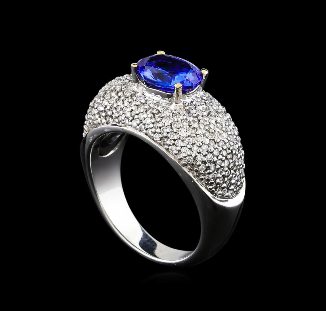 One electronically tested 14KT white gold ladies combination cast & assembled tanzanite and diamond ring with a flat shank with rounded edges with a bright polish finish. Identified with markings of "14K". Condition is new. Containing: One prong set oval modified brilliant cut natural tanzanite, measuring 8.83 x 6.87 x 4.47mm, approximate weight of 1.85ct., clarity is eye clean, type I, medium, moderately strong, bluish violet color, (GIA bV 5/4), cut is very good. One Hundred Eighty pave' set round brilliant cut diamonds, measuring 1.10 - 1.10 x 0.66mm (depth est.) approximate total weight of 180 Stones = 0.86ct. Clarity: SI-2 to I-1. Color: I - J, Cut is Good. Colored gemstones are presumed to have been subjected to commonly used enhancement processes. All diamonds and colored gemstones are graded in the mounting, unless otherwise stated. Total Weight of Colored Stones 1.85ct. Total Weight of Diamonds 0.86ct. Total Weight of Ring 11.20 grams. GGL Appraised at $9,925.00.