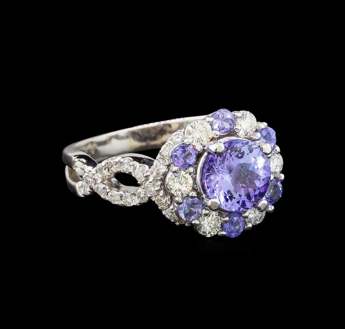One electronically tested 14KT white gold ladies cast tanzanite and diamond ring with a bright polish finish. Identified with markings of "14K". Condition is new. Containing: One prong set round modified brilliant cut natural tanzanite, measuring 6.90 - 6.90 x 4.49 mm, approximate weight of 1.43ct., clarity is eye clean, type I, light, very slightly grayish, violet color, (GIA V 3/3), cut is good. Six prong set round modified brilliant cut natural tanzanites, measuring 2.50 - 2.50 x 1.63 mm, approximate total weight of 0.42ct., clarity is eye clean, type I, light, very slightly grayish, violet color, (GIA V 3/3), cut is good. Six prong set round brilliant cut diamonds, measuring 2.40 - 2.40 x 1.44mm (depth est.) approximate total weight of 6 Stones = 0.30ct. Clarity: SI-1 to SI-2. Color: I - J, Cut is Good. Thirty-Eight prong set round brilliant cut diamonds, measuring 1.50 - 1.50 x 0.90mm (depth est.) approximate total weight of 38 Stones = 0.47ct. Clarity: SI-1 to SI-2. Color: I - J, Cut is Good. Colored gemstones are presumed to have been subjected to commonly used enhancement processes. All diamonds and colored gemstones are graded in the mounting, unless otherwise stated. Total Weight of Colored Stones 1.85ct. Total Weight of Diamonds 0.77ct. Total Weight of Ring 5.30 grams. GGL Appraised at $3,695.00.