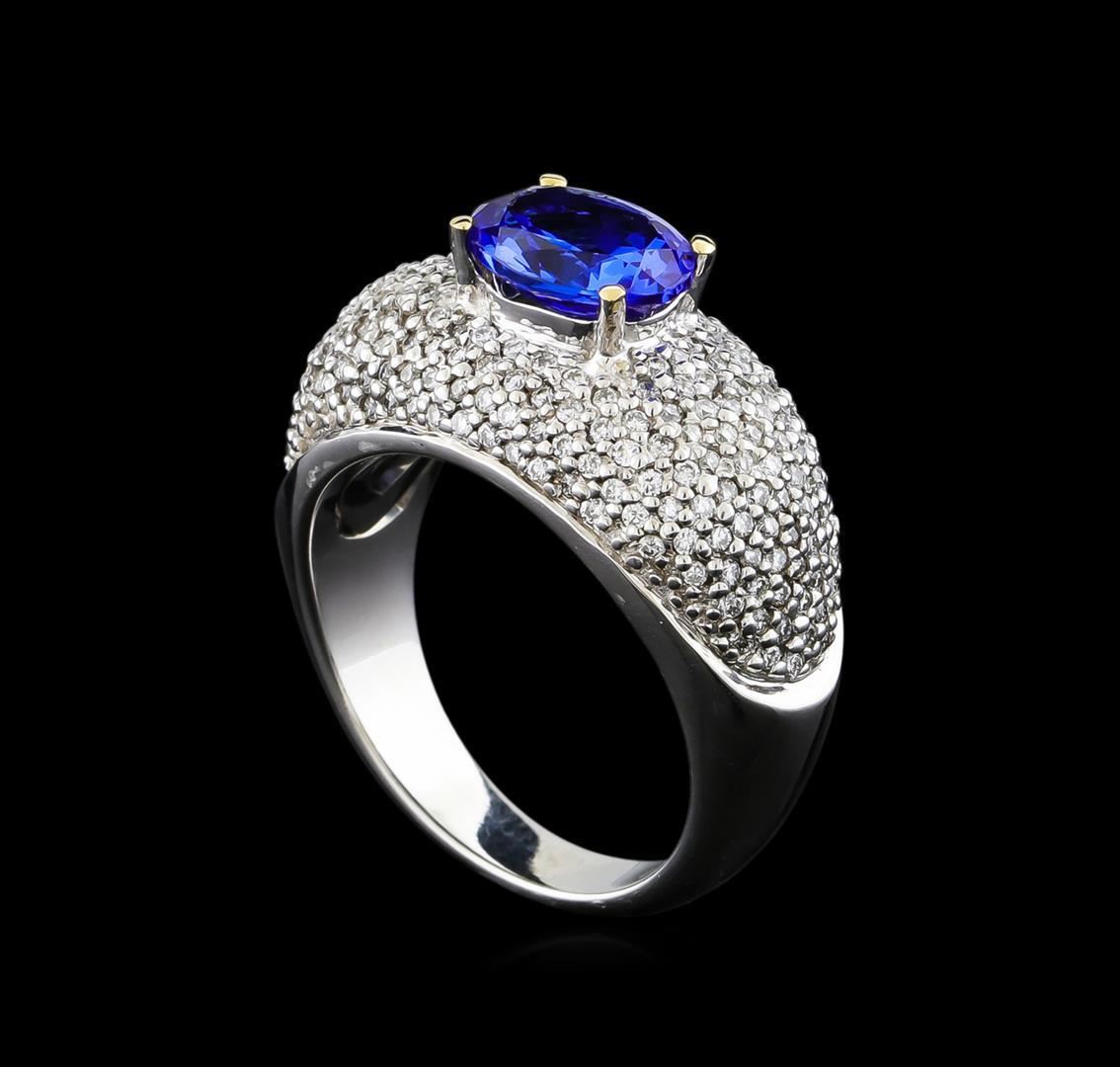 One electronically tested 14KT white gold ladies combination cast & assembled tanzanite and diamond ring with a flat shank with rounded edges with a bright polish finish. Identified with markings of "14K". Condition is new. Containing: One prong set oval modified brilliant cut natural tanzanite, measuring 8.83 x 6.87 x 4.47mm, approximate weight of 1.85ct., clarity is eye clean, type I, medium, moderately strong, bluish violet color, (GIA bV 5/4), cut is very good. One Hundred Eighty pave' set round brilliant cut diamonds, measuring 1.10 - 1.10 x 0.66mm (depth est.) approximate total weight of 180 Stones = 0.86ct. Clarity: SI-2 to I-1. Color: I - J, Cut is Good. Colored gemstones are presumed to have been subjected to commonly used enhancement processes. All diamonds and colored gemstones are graded in the mounting, unless otherwise stated. Total Weight of Colored Stones 1.85ct. Total Weight of Diamonds 0.86ct. Total Weight of Ring 11.20 grams. GGL Appraised.