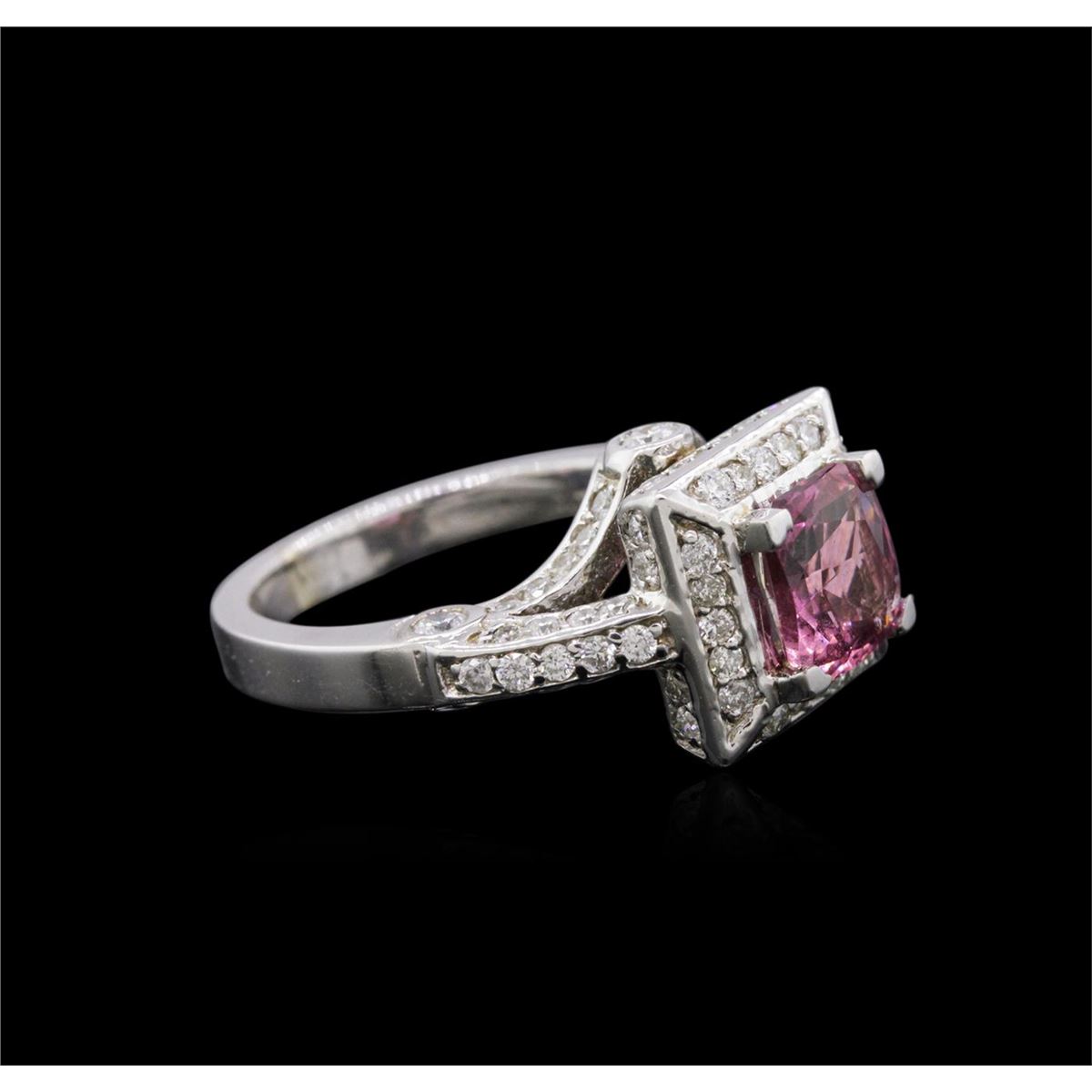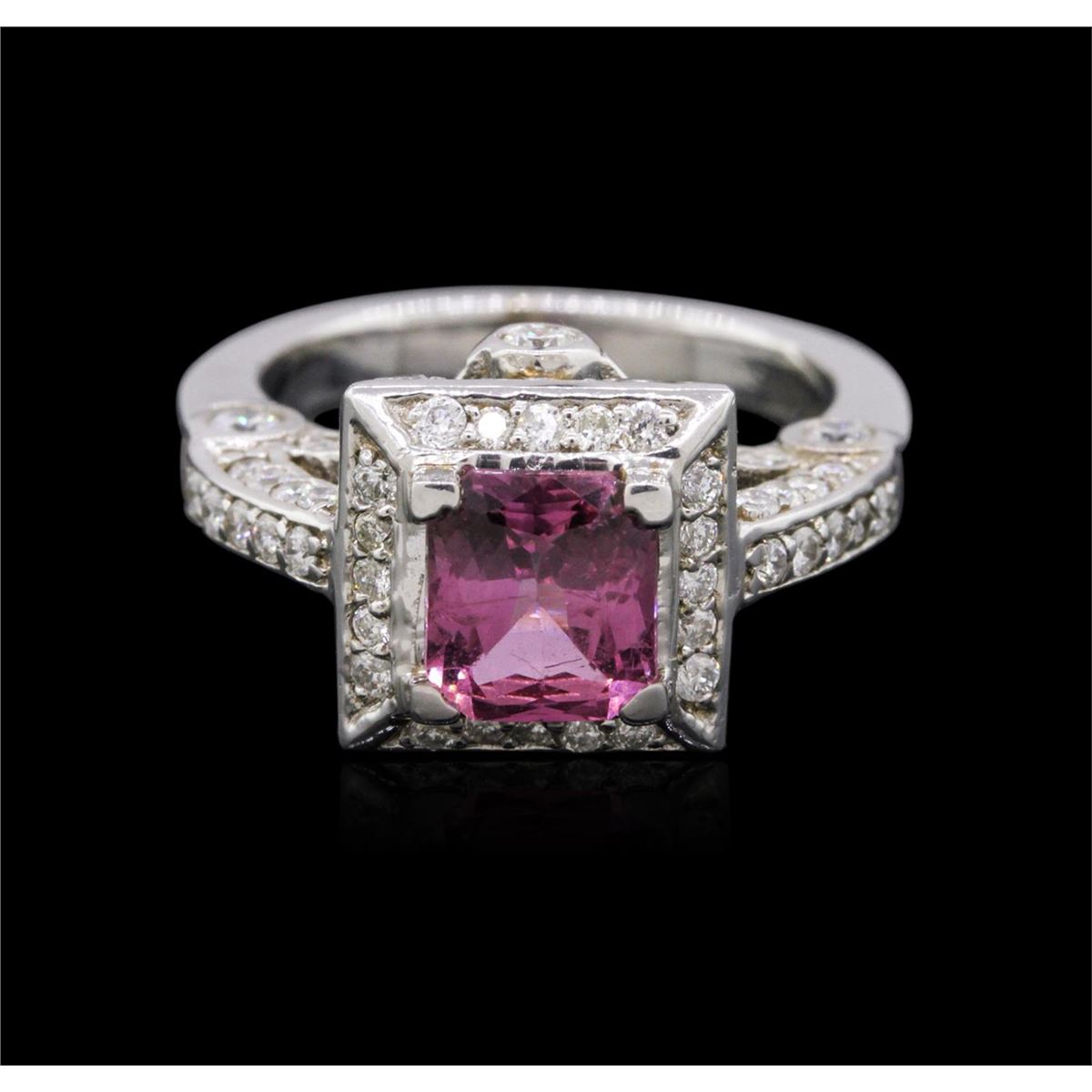 One electronically tested 14KT white gold ladies combination cast & assembled sapphire and diamond ring with a cathedral shank with a bright polish finish. Identified with markings of "14K". Condition is new. Containing: One prong set radiant modified brilliant cut natural pink sapphire, measuring 7.07 x 6.45 x 3.90mm, approximate weight of 1.85ct., clarity is slightly included, type II, medium, slightly grayish, reddish purple color, (GIA rP 5/2), cut is good. Eighty-Six prong set round brilliant cut diamonds, measuring 1.30 - 1.30 x 0.78mm (depth est.) approximate total weight of 86 Stones = 0.69ct. Clarity: SI-2 to I-1. Color: I - J, Cut is Good. Six bezel set round brilliant cut diamonds, measuring 2.20 - 2.20 x 1.32mm (depth est.) approximate total weight of 6 Stones = 0.23ct. Clarity: SI-1 to SI-2. Color: J - K, Cut is Good. All diamonds and colored gemstones are graded in the mounting, unless otherwise stated. Colored gemstones are presumed to have been subjected to commonly used enhancement processes. Total Weight of Colored Stones 1.85ct. Total Weight of Diamonds 0.92ct. Total Weight of Ring 8.10 grams. GGL Appraised at $6,695.00.