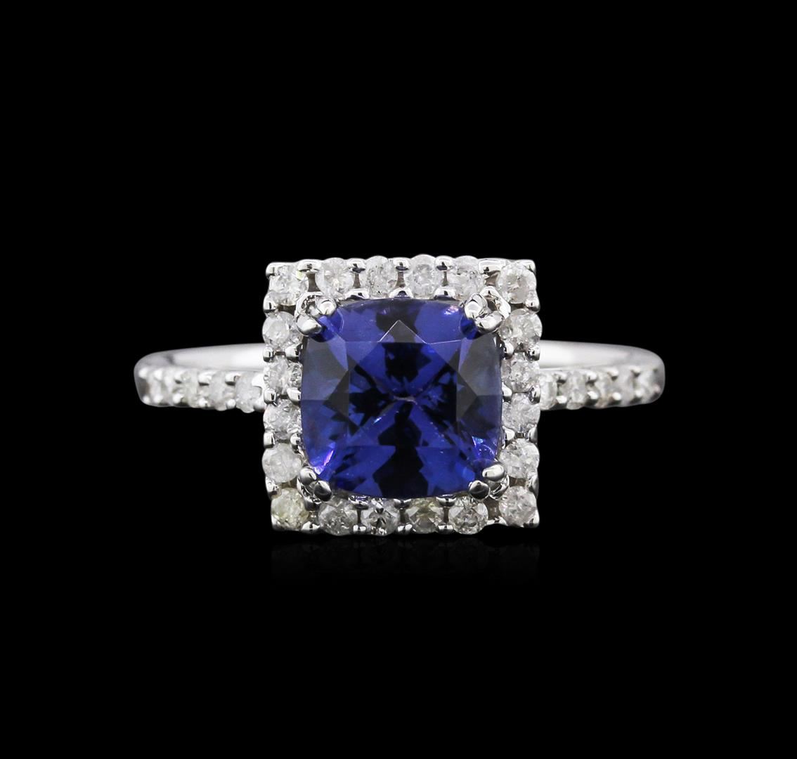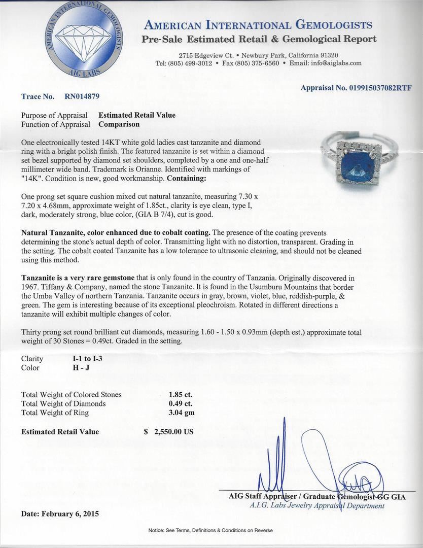 One electronically tested 14KT white gold ladies cast tanzanite and diamond ring with a bright polish finish. The featured tanzanite is set within a diamond set bezel supported by diamond set shoulders, completed by a one and one-half millimeter wide band. Trademark is Orianne. Identified with markings of "14K". Condition is new, good workmanship. Containing: One prong set square cushion mixed cut natural tanzanite, measuring 7.30 x 7.20 x 4.68mm, approximate weight of 1.85ct., clarity is eye clean, type I, dark, moderately strong, blue color, (GIA B 7/4), cut is good. Natural Tanzanite, color enhanced due to cobalt coating. The presence of the coating prevents determining the stone's actual depth of color. Transmitting light with no distortion, transparent. Grading in the setting. The cobalt coated Tanzanite has a low tolerance to ultrasonic cleaning, and should not be cleaned using this method. Tanzanite is a very rare gemstone that is only found in the country of Tanzania. Originally discovered in 1967. Tiffany & Company, named the stone Tanzanite. It is found in the Usumburu Mountains that border the Umba Valley of northern Tanzania. Tanzanite occurs in gray, brown, violet, blue, reddish-purple, & green. The gem is interesting because of its exceptional pleochroism. Rotated in different directions a tanzanite will exhibit multiple changes of color. Thirty prong set round brilliant cut diamonds, measuring 1.60 - 1.50 x 0.93mm (depth est.) approximate total weight of 30 Stones = 0.49ct. Graded in the setting. Clarity: I-1 to I-3. Color: H - J. Total Weight of Colored Stones: 1.85 ct. Total Weight of Diamonds: 0.49 ct. Total Weight of Ring: 3.04 gm. AIG Appraised at $2,550.00.