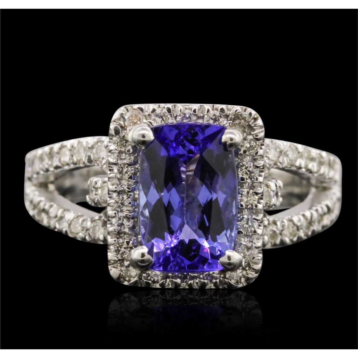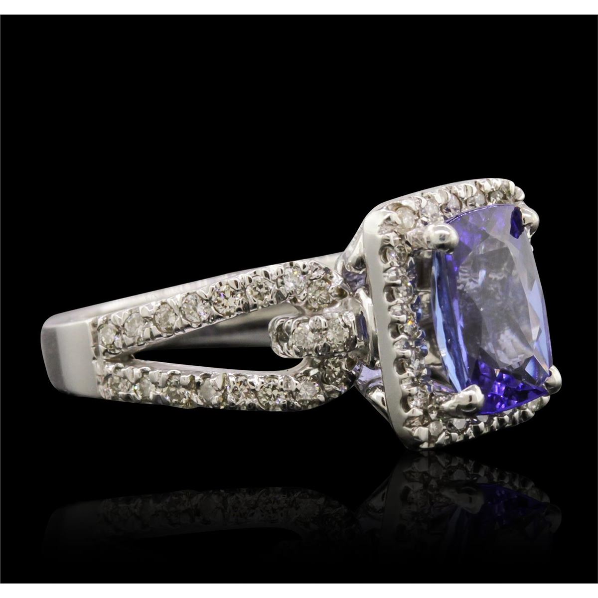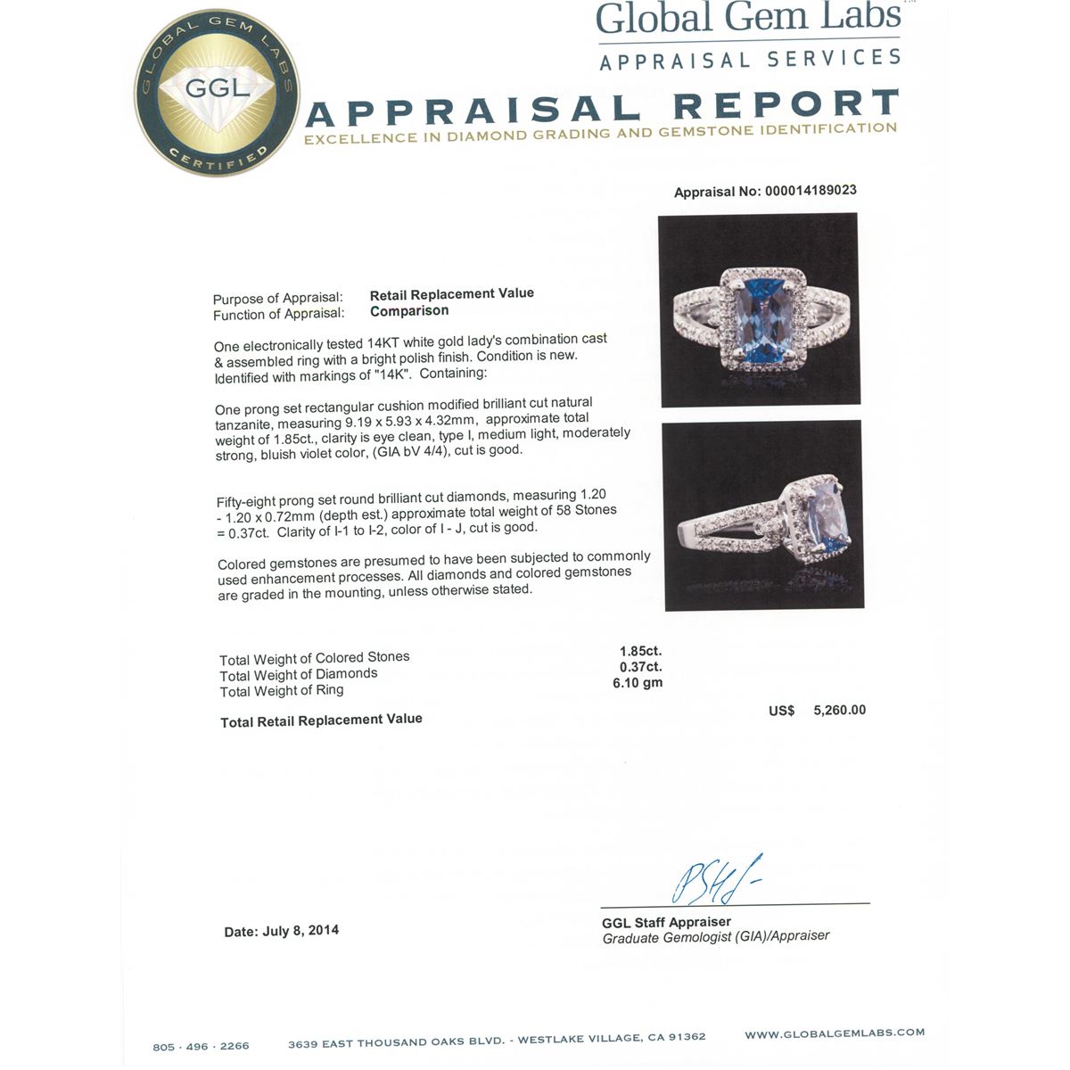 One electronically tested 14KT white gold Ladies combination cast & assembled ring with a bright polish finish. Condition is new. Identified with markings of "14K". Containing: One prong set rectangular cushion modified brilliant cut natural tanzanite, measuring 9.19 x 5.93 x 4.32mm, approximate. Total Weight of 1.85ct., clarity is eye clean, type I, medium light, moderately strong, bluish violet color, (GIA bV 4/4), cut is good. Fifty-Eight prong set round brilliant cut diamonds, measuring 1.20 - 1.20 x 0.72mm (depth est.) approximate. Total Weight of 58 Stones = 0.37ct. Clarity: I-1 to I-2. Color: I - J, Cut is Good. Colored gemstones are presumed to have been subjected to commonly used enhancement processes. All diamonds and colored gemstones are graded in the mounting, unless otherwise stated. Total Weight of Colored Stones 1.85ct. Total Weight of Diamonds 0.37ct. Total Weight of Ring 6.10 grams. GGL Appraised at $5,260.00.