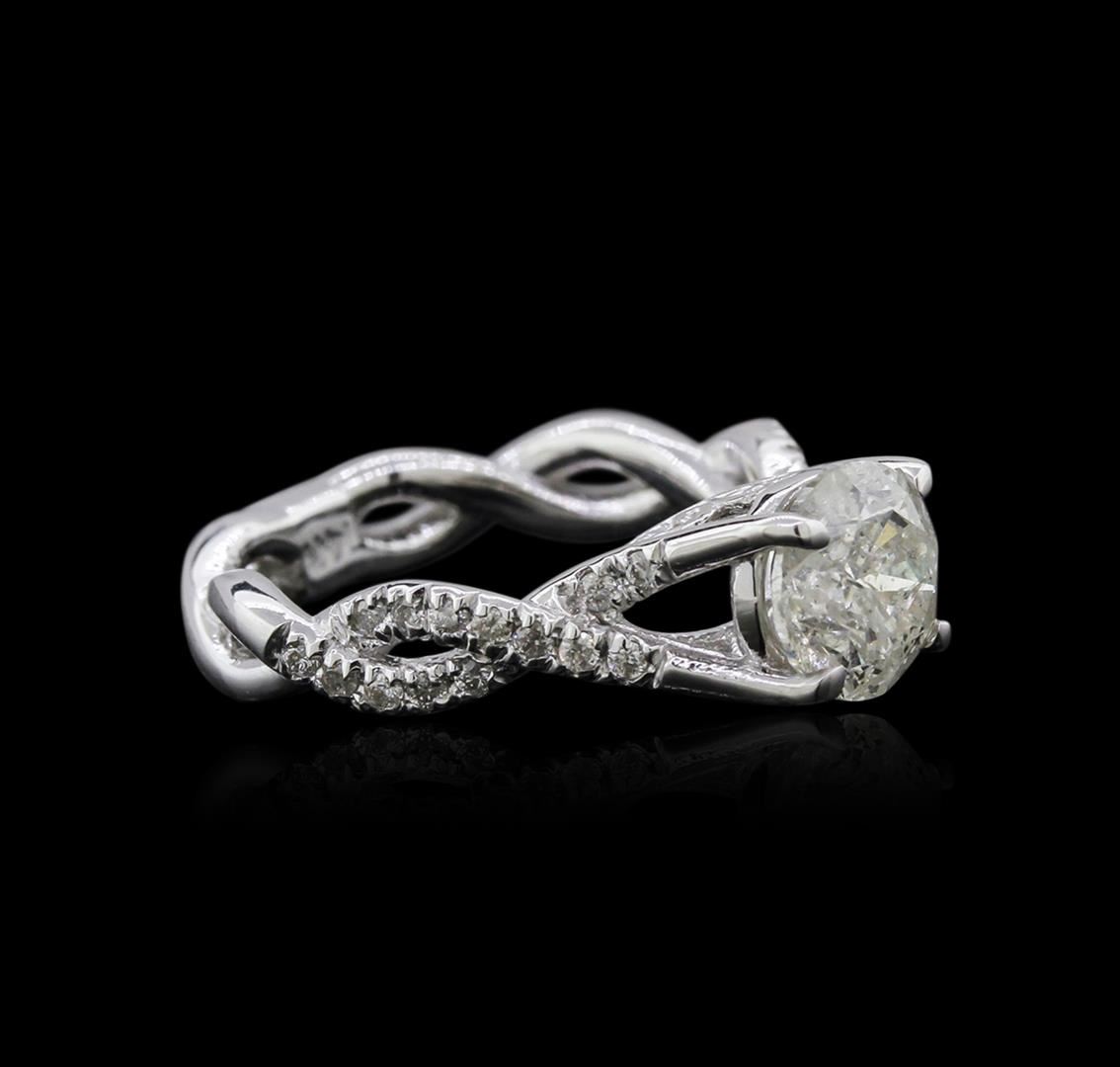 One electronically tested 14KT white gold ladies cast diamond engagement ring with a bright polish finish. Identified with markings of "14K". Condition is very good. Containing: One prong set round brilliant cut diamond, measuring 7.50 - 7.40 x 5.08mm (depth est.) approximate weight of 1.72ct. Clarity: I-3. Color: J, Cut is Good. Twenty-Eight prong set round brilliant cut diamonds, measuring 1.10 - 1.10 x 0.66mm (depth est.) approximate. Total Weight of 28 Stones = 0.13ct. Clarity: I-1 to I-2. Color: I - J, Cut is Very Good. All diamonds are graded in the mounting, unless otherwise stated. Total Weight of Diamonds 1.85ct. Total Weight of Engagement Ring 4.80 grams. GGL Appraised at $5,880.00.