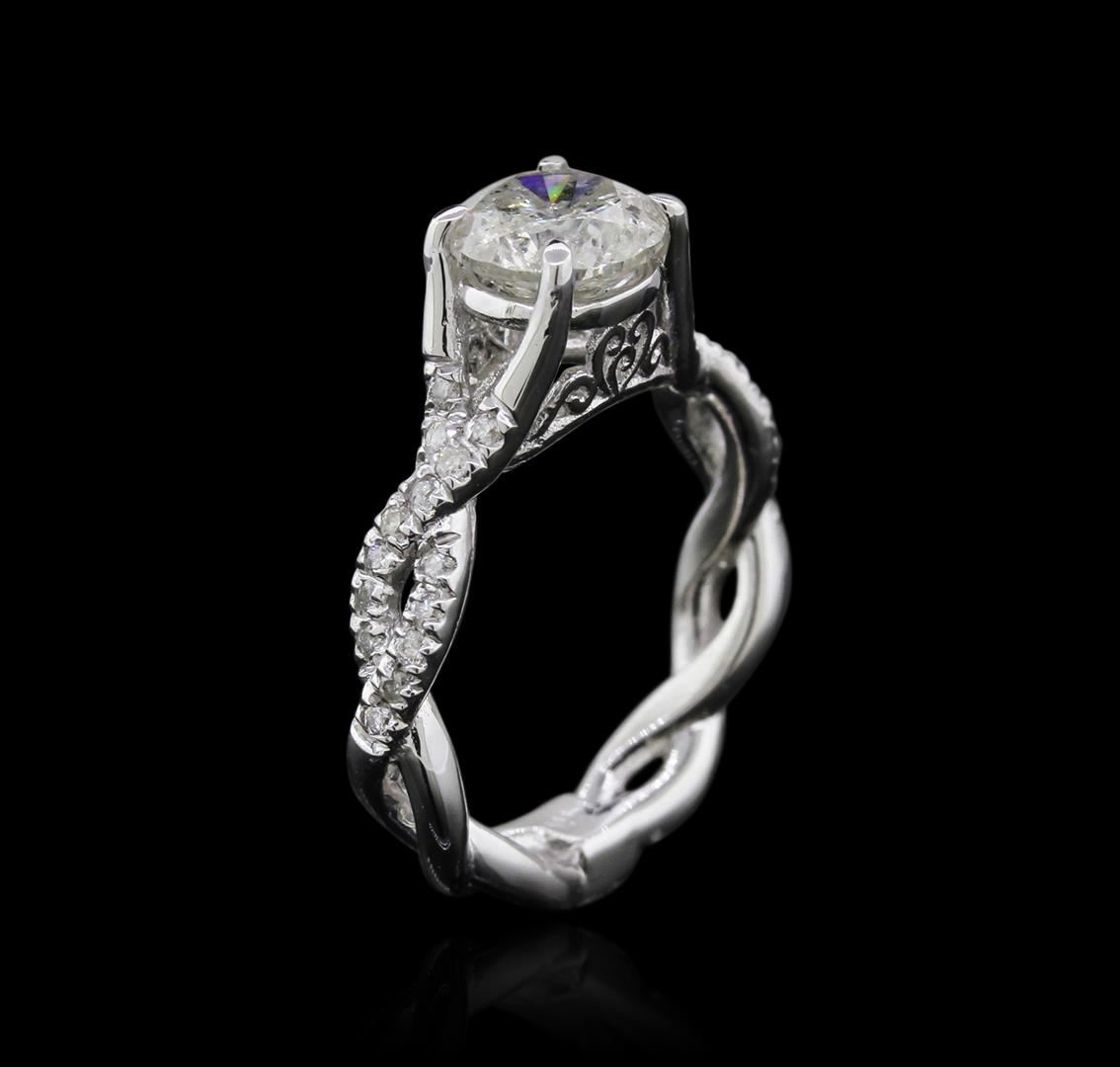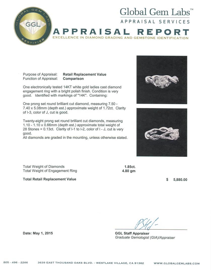 One electronically tested 14KT white gold ladies cast diamond engagement ring with a bright polish finish. Identified with markings of "14K". Condition is very good. Containing: One prong set round brilliant cut diamond, measuring 7.50 - 7.40 x 5.08mm (depth est.) approximate weight of 1.72ct. Clarity: I-3. Color: J, Cut is Good. Twenty-Eight prong set round brilliant cut diamonds, measuring 1.10 - 1.10 x 0.66mm (depth est.) approximate. Total Weight of 28 Stones = 0.13ct. Clarity: I-1 to I-2. Color: I - J, Cut is Very Good. All diamonds are graded in the mounting, unless otherwise stated. Total Weight of Diamonds 1.85ct. Total Weight of Engagement Ring 4.80 grams. GGL Appraised at $5,880.00.