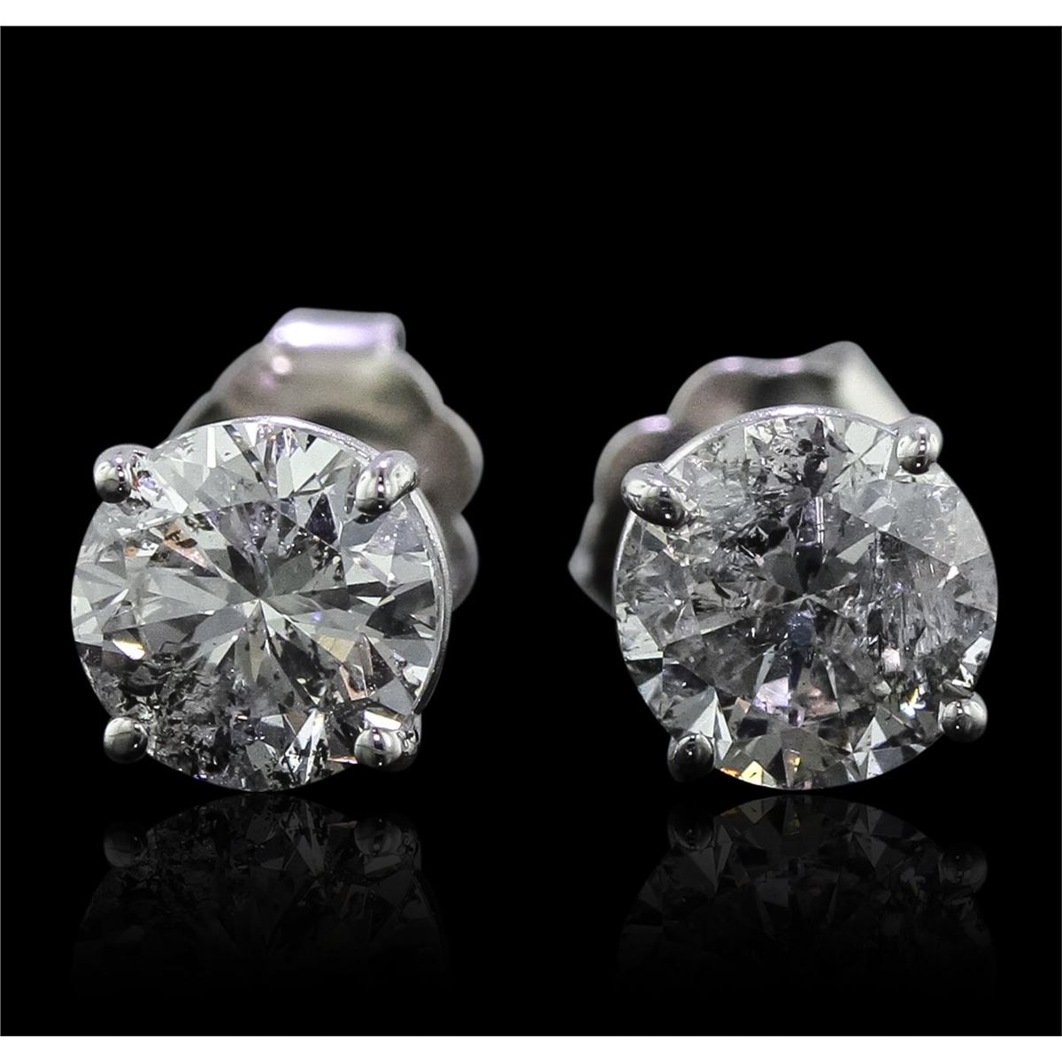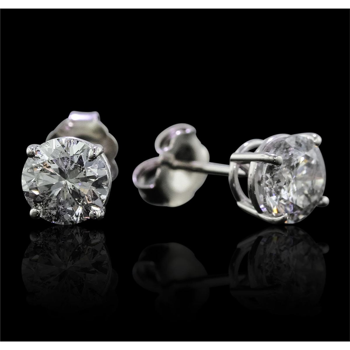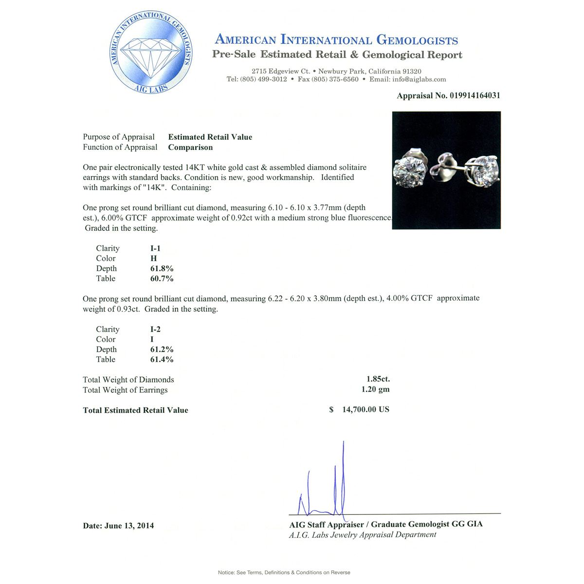 One pair electronically tested 14KT white gold cast & assembled diamond solitaire earrings with standard backs. Condition is new, good workmanship. Identified with markings of "14K". Containing: One prong set round brilliant cut diamond, measuring 6.10 - 6.10 x 3.77mm (depth est.), 6.00.%. GTCF approximate weight of 0.92ct with a medium strong blue fluorescence. Graded in the setting. Clarity: I-1. Color: HDepth 61.8%. Table 60.7%. One prong set round brilliant cut diamond, measuring 6.22 - 6.20 x 3.80mm (depth est.), 4.00.%. GTCF approximate weight of 0.93ct. Graded in the setting. Clarity: I-2. Color: IDepth 61.2%. Table 61.4%. Total Weight of Diamonds 1.85ct. Total Weight of Earrings 1.20 grams. AIG Appraised at $14,700.00.