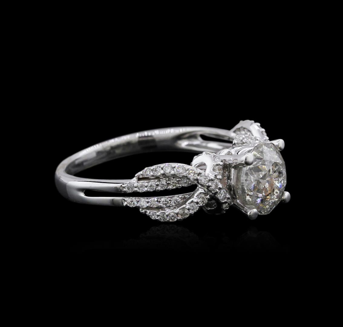 One electronically tested 14KT white gold ladies cast diamond engagement ring with a bright polish finish. Condition is very good. Containing: One prong set round brilliant cut diamond, measuring 7.20 - 7.20 x 4.77mm (depth est.) approximate weight of 1.51ct. Clarity: I-3. Color: J, Cut is Good. Fifty-Six prong set round brilliant cut diamonds, measuring 1.20 - 1.20 x 0.72mm (depth est.) approximate. Total Weight of 56 Stones = 0.35ct. Clarity: SI-2 to I-2. Color: I - J, Cut is Good. All diamonds are graded in the mounting, unless otherwise stated. Total Weight of Diamonds 1.86ct. Total Weight of Engagement Ring 3.70 grams. GGL Appraised at $5,170.00.
